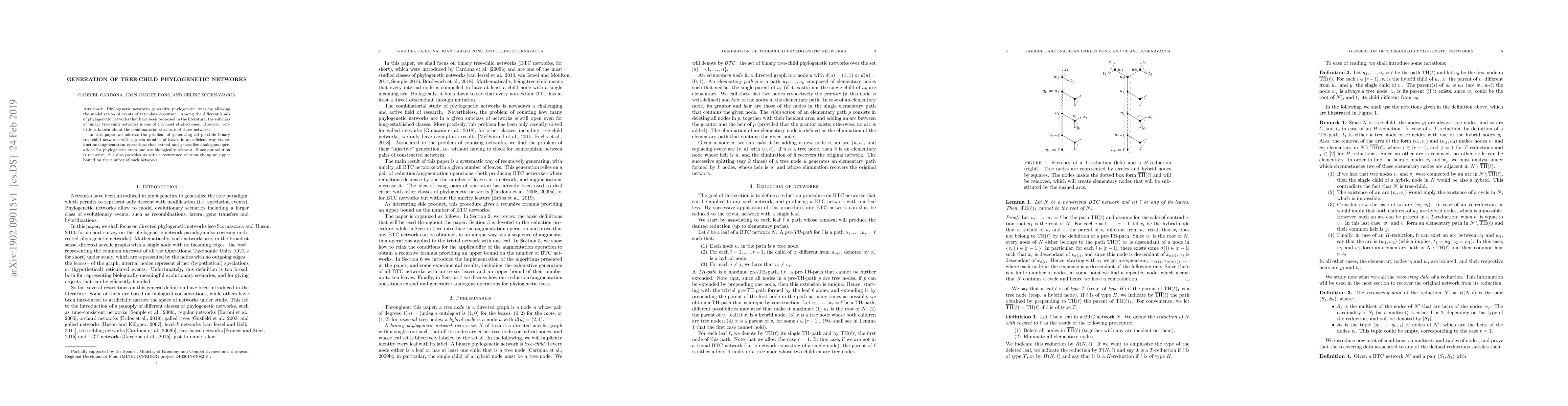 This paper presents an efficient method for generating all possible binary tree-child phylogenetic networks with a specified number of leaves using reduction/augmentation operations. It also provides a recurrence relation to determine the upper bound on the number of such networks, offering insights into their combinatorial structure.