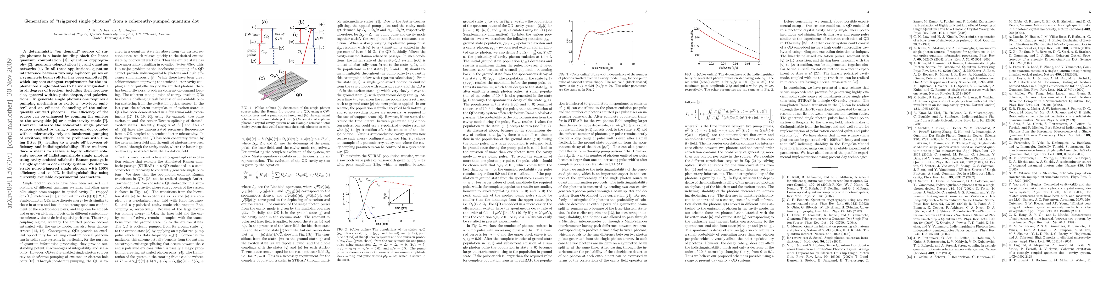 A deterministic "on demand" source of single photons is a basic building block for linear quantum computation \cite{linear}, quantum cryptography \cite{crypto}, quantum teleportation \cite{teleport}, and quantum networks \cite{network}. In all these applications, quantum interference between two single-photon pulses on a symmetric beam splitter has been exploited \cite{review}, which imposes stringent requirement for the implemented single photons to be indistinguishable in all degrees of freedom, including their frequencies, spectral widths, pulse shapes, and polarizations. To generate single photons one requires a pumping mechanism to excite a "two-level emitter" and an efficient channeling of the subsequently emitted photons. The efficiency of the source can be enhanced by coupling the emitter to the waveguide \cite{manga} or a microcavity mode \cite{cklaw}. However, hitherto the solid-state single photon sources realized by using a quantum dot coupled with a microcavity rely on incoherent pumping of excitons, which leads to problems with timing jitter \cite{kiraz}, leading to a trade off between efficiency and indistinguishability. Here we introduce a means to realize a highly efficient solid state source of indistinguishable single photons using cavity-assisted adiabatic Raman passage in a single quantum dot - cavity system. We demonstrate pulse-triggered single photons with 100% efficiency and $>90$% indistinguishability using currently available experimental parameters.