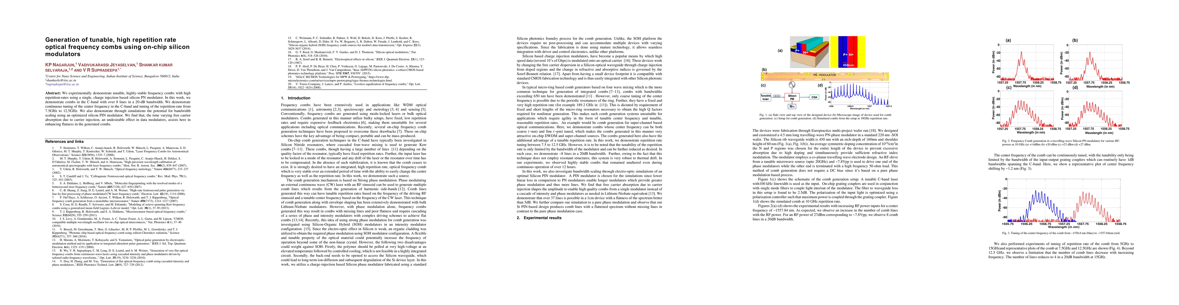 We experimentally demonstrate tunable, highly-stable frequency combs with high repetition-rates using a single, charge injection based silicon PN modulator. In this work, we demonstrate combs in the C-band with over 8 lines in a 20-dB bandwidth. We demonstrate continuous tuning of the center frequency in the C-band and tuning of the repetition-rate from 7.5GHz to 12.5GHz. We also demonstrate through simulations the potential for bandwidth scaling using an optimized silicon PIN modulator. We find that, the time varying free carrier absorption due to carrier injection, an undesirable effect in data modulators, assists here in enhancing flatness in the generated combs.