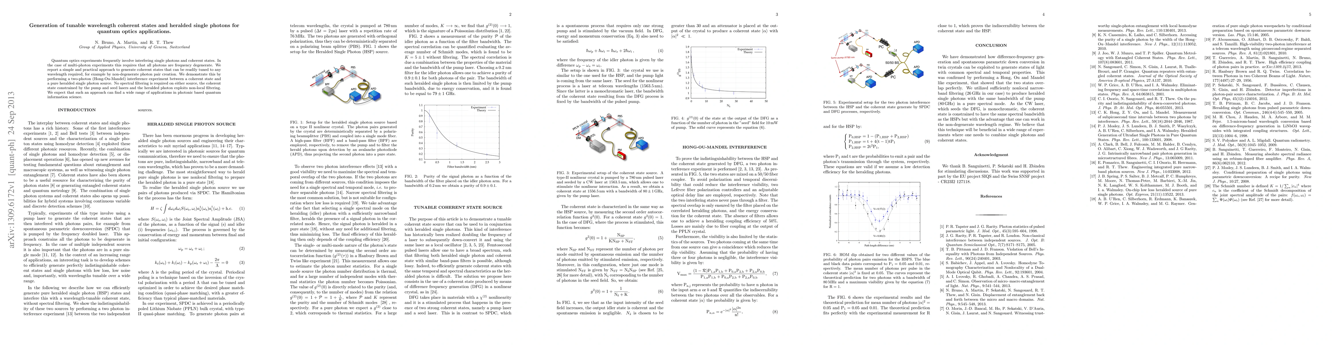 This paper presents a method to generate tunable wavelength coherent states and heralded single photons, enabling multi-photon experiments without spectral filtering. The approach allows for practical tuning of coherent states for quantum optics applications, demonstrated through a Hong-Ou-Mandel interference experiment.