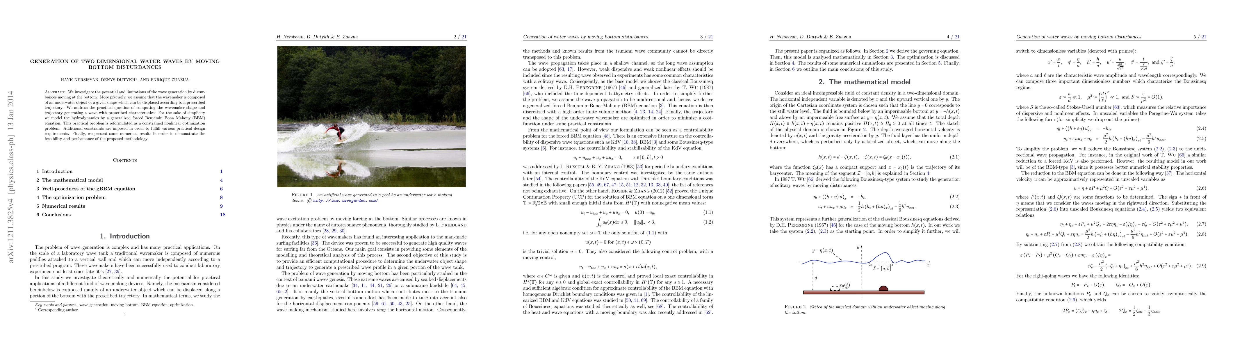 This paper explores the generation of two-dimensional water waves through moving bottom disturbances using a wavemaker modeled by a generalized forced Benjamin-Bona-Mahony equation. It formulates the problem as a constrained nonlinear optimization to determine the optimal wavemaker shape and trajectory for prescribed wave characteristics, demonstrating feasibility through numerical results.