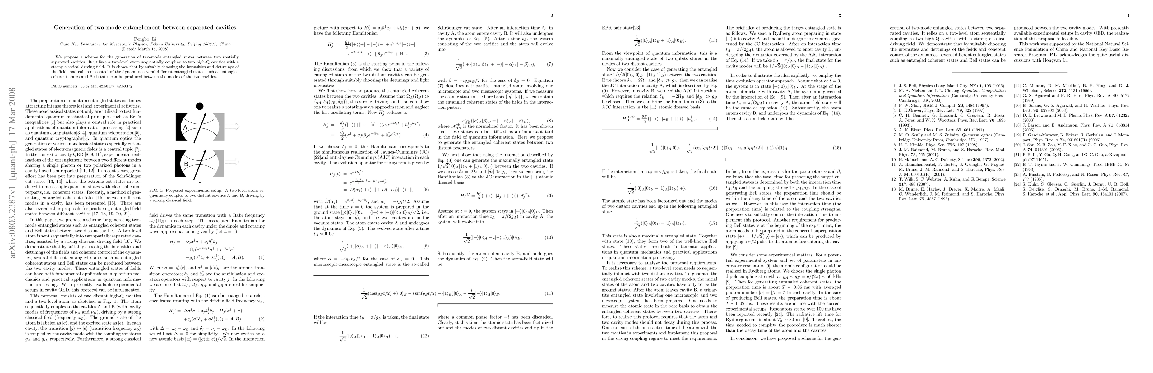 The paper proposes a method to create two-mode entanglement between two spatially separated cavities using a two-level atom and strong classical driving fields, achieving various entangled states through dynamic control. This approach offers a pathway for generating multi-cavity entangled states for quantum communication applications.