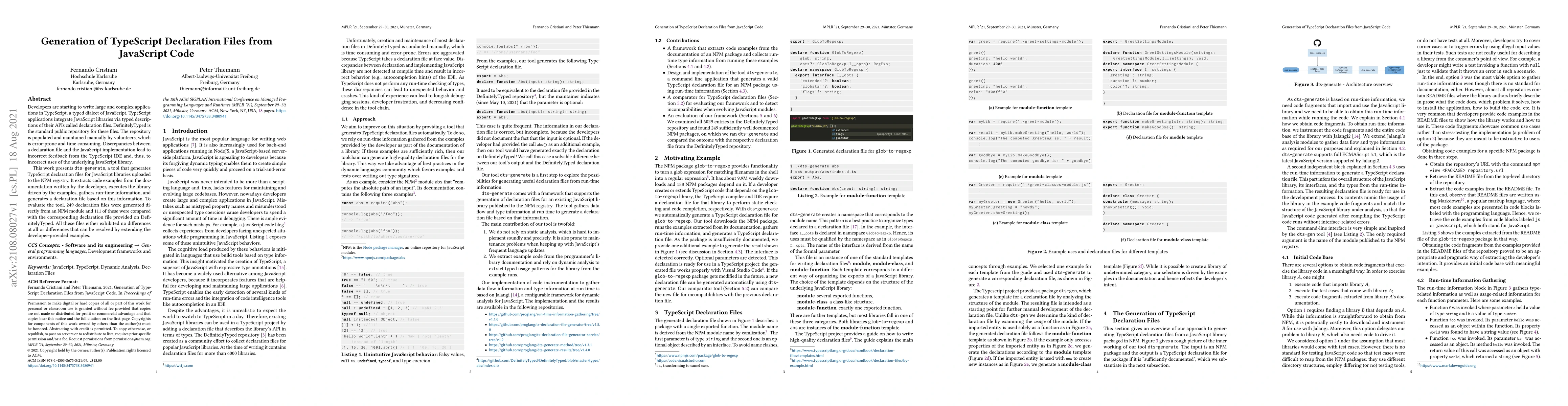 The paper introduces dts-generate, a tool that automates the creation of TypeScript declaration files from JavaScript libraries on NPM by extracting examples and gathering runtime information, reducing errors in DefinitelyTyped. Evaluation shows high accuracy, with generated files either matching existing declarations or requiring minor example extensions.