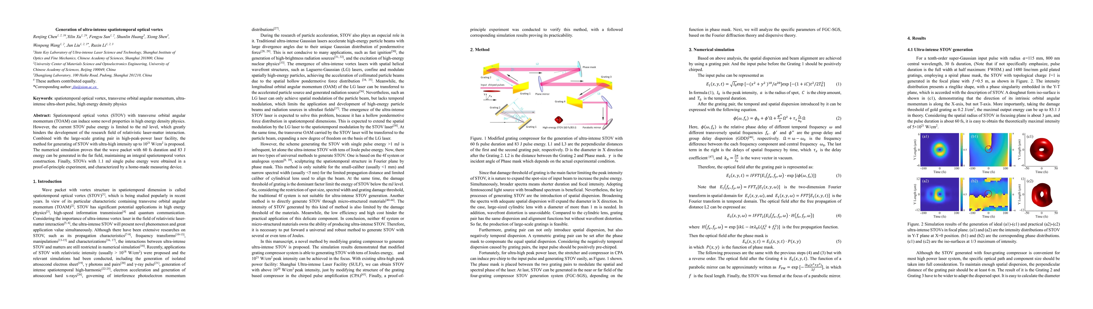 The research proposes a method for generating ultra-intense spatiotemporal optical vortices (STOV) using a Fourier grating compressor-spiral grating pair (FGC-SGS) method, avoiding limitations of grating damage thresholds and large-aperture cylindrical lenses.