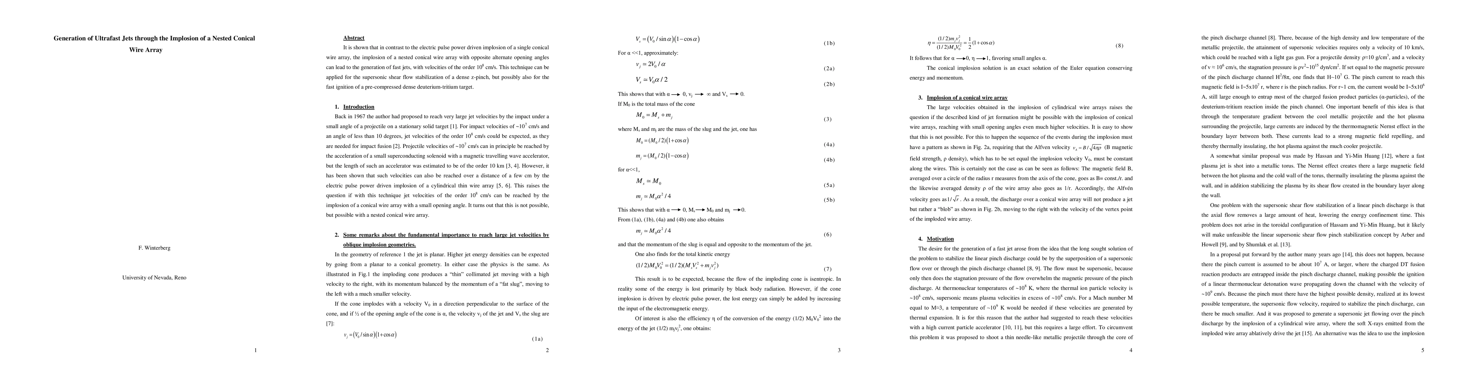 Summary: The implosion of a nested conical wire array with alternating opening angles generates ultrafast jets at velocities around 108 cm/s, contrasting with single conical wire arrays. This method may stabilize supersonic shear flows in dense z-pinch applications and potentially enable fast ignition in pre-compressed deuterium-tritium targets.