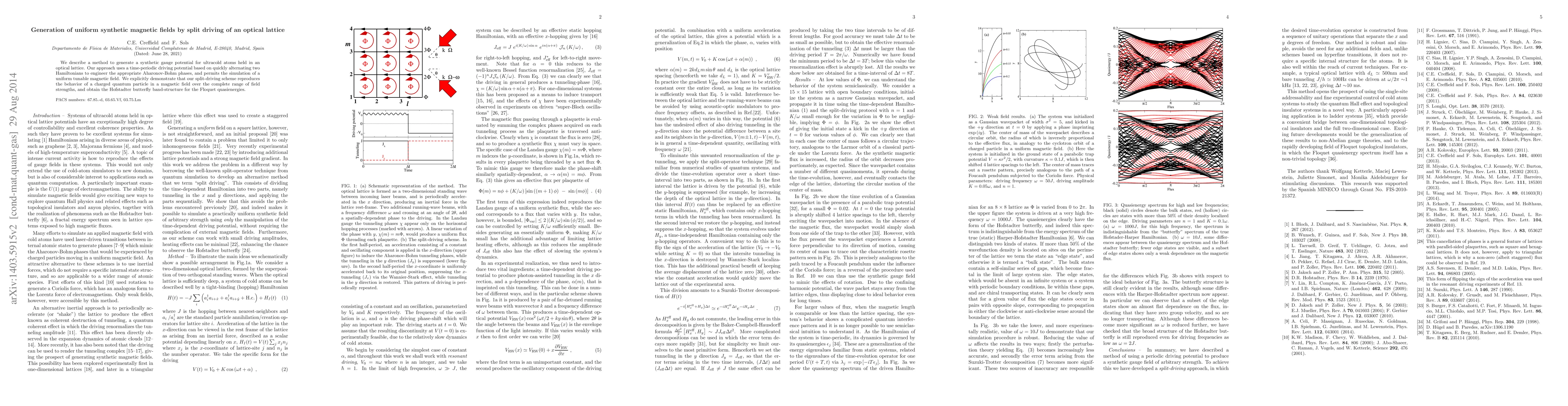 This paper presents a method to create a synthetic uniform magnetic field using split driving of an optical lattice, enabling the simulation of charged quantum particles in a magnetic field. The technique employs alternating time-periodic signals to generate Aharonov-Bohm phases, resulting in the Hofstadter butterfly band-structure at high fluxes.