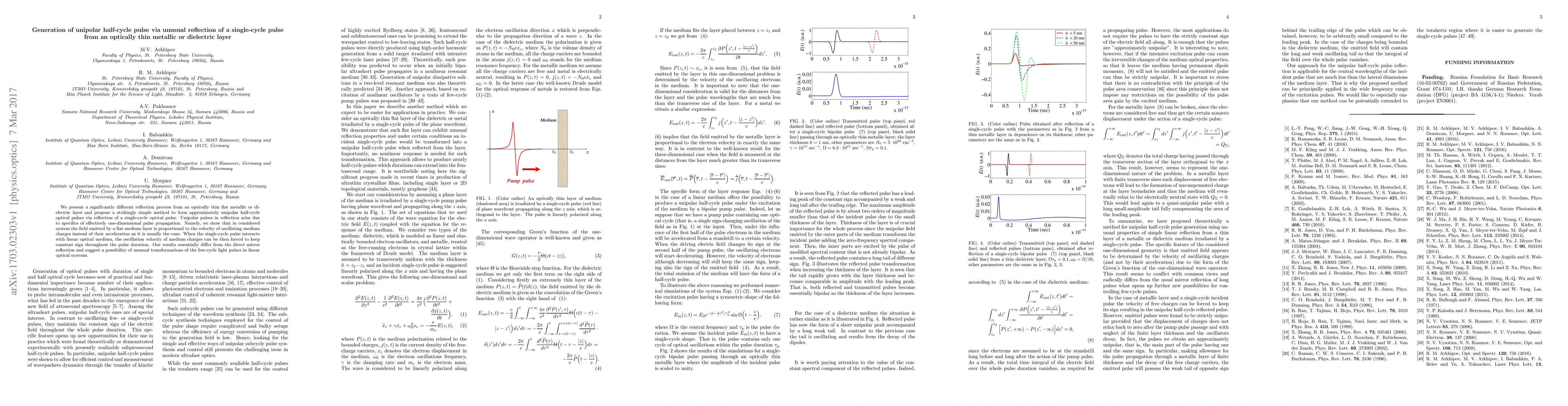 This paper proposes a novel method to generate unipolar half-cycle optical pulses by reflecting a single-cycle pulse from an optically thin metallic or dielectric layer. The reflection process differs from typical mirror reflection, as it results from the velocity of oscillating medium charges rather than their acceleration, leading to constant-sign oscillations.