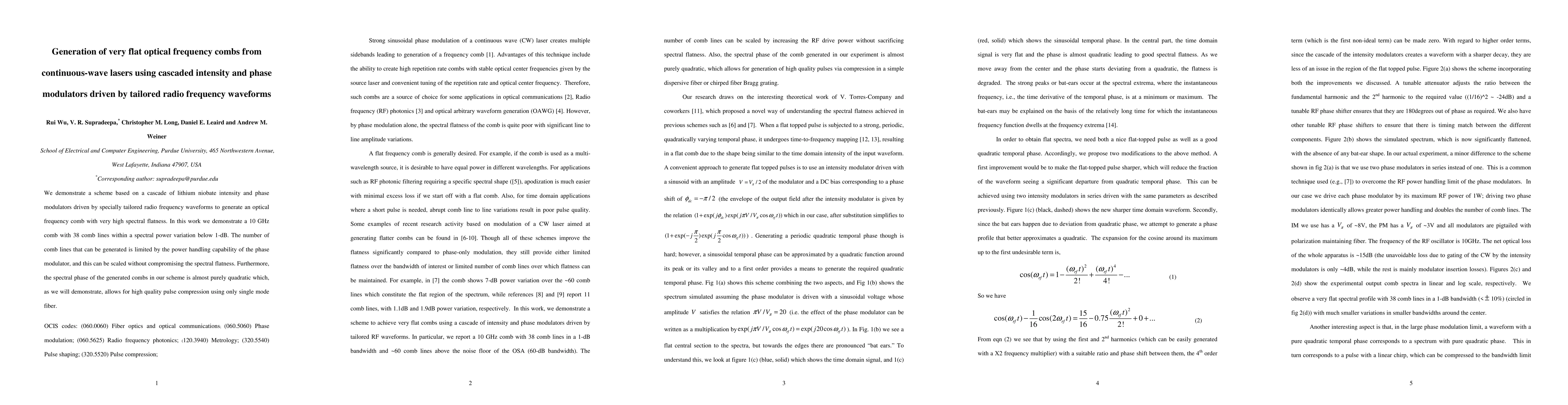 We demonstrate a scheme, based on a cascade of lithium niobate intensity and phase modulators driven by specially tailored radio frequency waveforms to generate an optical frequency comb with very high spectral flatness. In this work we demonstrate a 10 GHz comb with ~40 lines with spectral power variation below 1-dB and ~60 lines in total. The number of lines that can be generated is limited by the power handling capability of the phase modulator, and this can be scaled without compromising the spectral flatness. Furthermore, the spectral phase of the generated combs in our scheme is almost purely quadratic which, as we will demonstrate, allows for very high quality pulse compression using only single mode fiber.