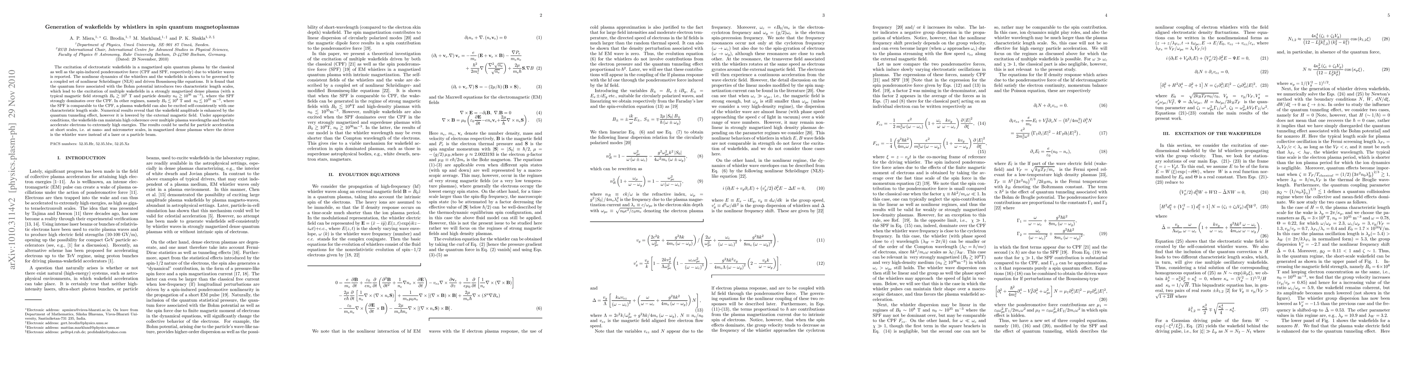 The excitation of electrostatic wakefields in a magnetized spin quantum plasma by the classical as well as the spin-induced ponderomotive force (CPF and SPF, respectively) due to whistler waves is reported. The nonlinear dynamics of the whistlers and the wakefields is shown to be governed by a coupled set of nonlinear Schr\"{o}dinger (NLS) and driven Boussinesq-like equations. It is found that the quantum force associated with the Bohm potential introduces two characteristic length scales, which lead to the excitation of multiple wakefields in a strongly magnetized dense plasma (with a typical magnetic field strength $B_{0}\gtrsim10^{9}$ T and particle density $n_{0}\gtrsim10^{36}$ m$^{-3}$), where the SPF strongly dominates over the CPF. In other regimes, namely $B_{0}\lesssim10^{8}$ T and $\ n_{0}\lesssim10^{35}$ m$^{-3}$, where the SPF is comparable to the CPF, a plasma wakefield can also be excited self-consistently with one characteristic length scale. Numerical results reveal that the wakefield amplitude is enhanced by the quantum tunneling effect, however it is lowered by the external magnetic field. Under appropriate conditions, the wakefields can maintain high coherence over multiple plasma wavelengths and thereby accelerate electrons to extremely high energies. The results could be useful for particle acceleration at short scales, i.e. at nano- and micrometer scales, in magnetized dense plasmas where the driver is the whistler wave instead of a laser or a particle beam.