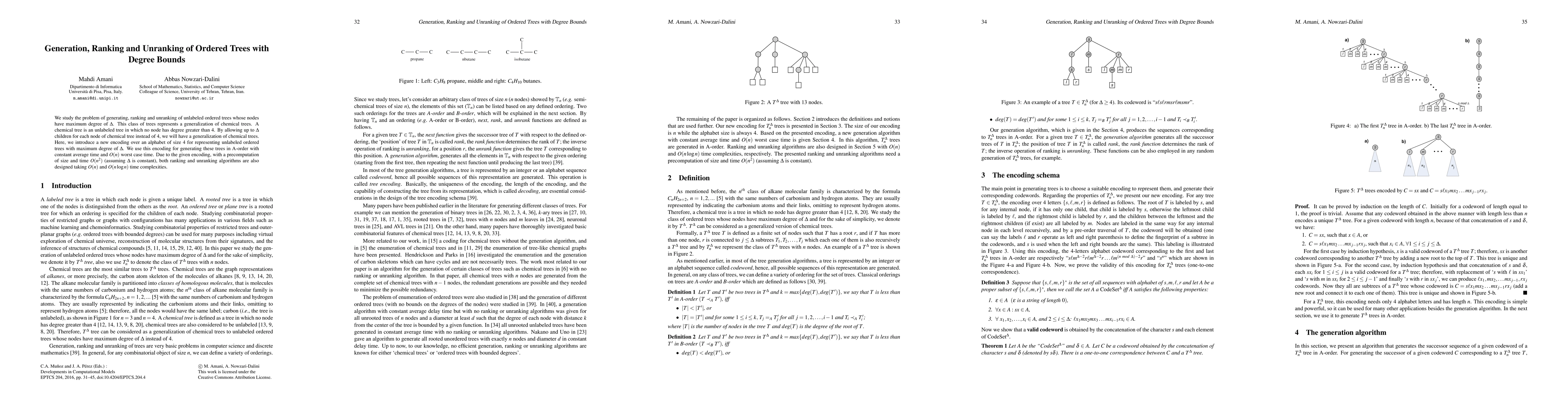 We study the problem of generating, ranking and unranking of unlabeled ordered trees whose nodes have maximum degree of $\Delta$. This class of trees represents a generalization of chemical trees. A chemical tree is an unlabeled tree in which no node has degree greater than 4. By allowing up to $\Delta$ children for each node of chemical tree instead of 4, we will have a generalization of chemical trees. Here, we introduce a new encoding over an alphabet of size 4 for representing unlabeled ordered trees with maximum degree of $\Delta$. We use this encoding for generating these trees in A-order with constant average time and O(n) worst case time. Due to the given encoding, with a precomputation of size and time O(n^2) (assuming $\Delta$ is constant), both ranking and unranking algorithms are also designed taking O(n) and O(nlogn) time complexities.