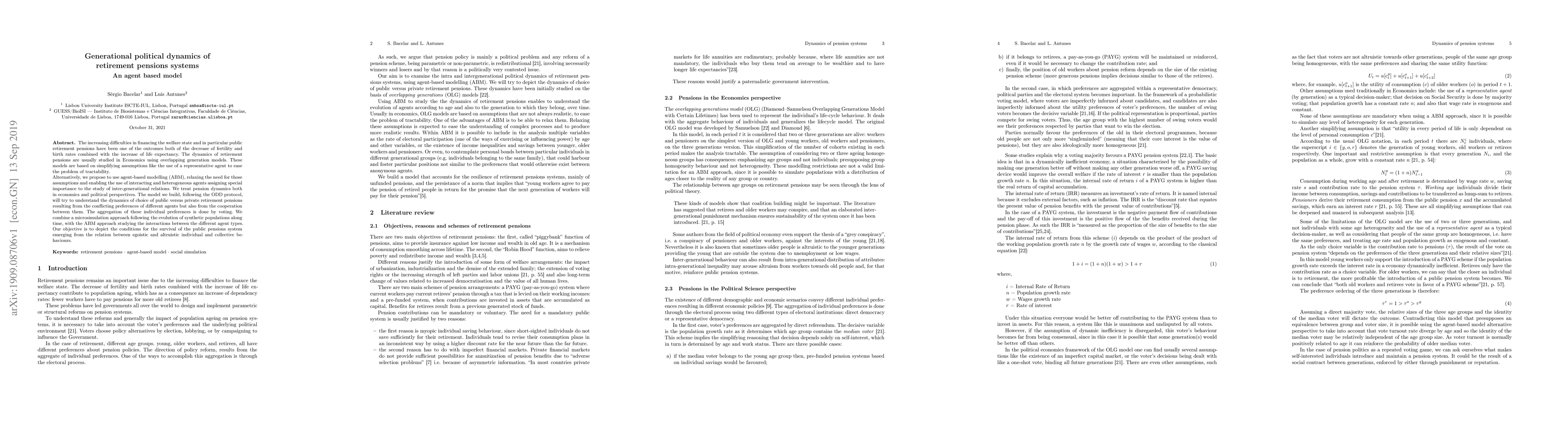 The increasing difficulties in financing the welfare state and in particular public retirement pensions have been one of the outcomes both of the decrease of fertility and birth rates combined with the increase of life expectancy. The dynamics of retirement pensions are usually studied in Economics using overlapping generation models. These models are based on simplifying assumptions like the use of a representative agent to ease the problem of tractability. Alternatively, we propose to use agent-based modelling (ABM), relaxing the need for those assumptions and enabling the use of interacting and heterogeneous agents assigning special importance to the study of inter-generational relations. We treat pension dynamics both in economics and political perspectives. The model we build, following the ODD protocol, will try to understand the dynamics of choice of public versus private retirement pensions resulting from the conflicting preferences of different agents but also from the cooperation between them. The aggregation of these individual preferences is done by voting. We combine a microsimulation approach following the evolution of synthetic populations along time, with the ABM approach studying the interactions between the different agent types. Our objective is to depict the conditions for the survival of the public pensions system emerging from the relation between egoistic and altruistic individual and collective behaviours.