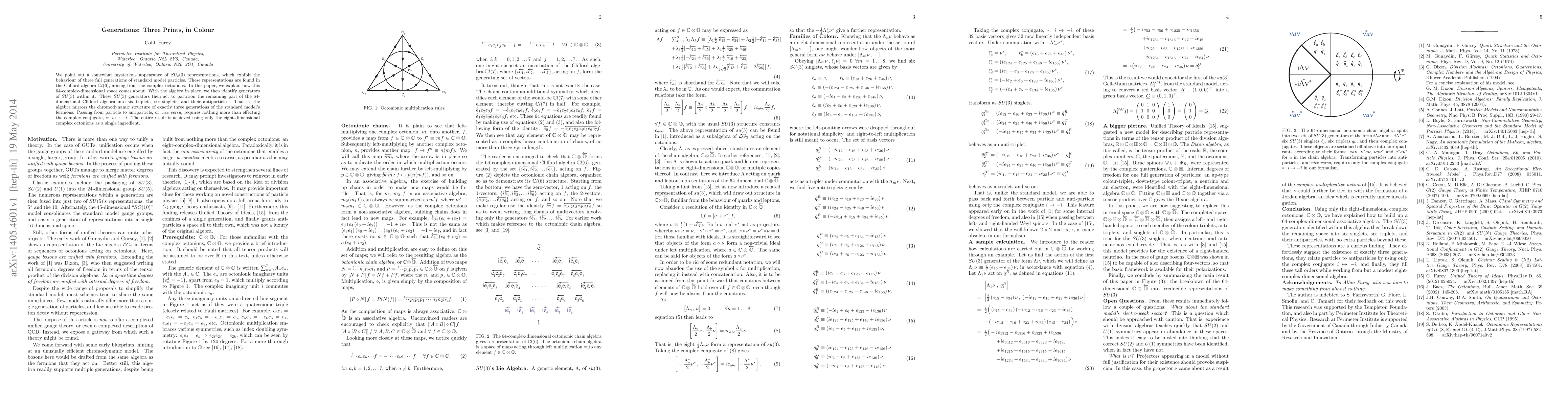 We point out a somewhat mysterious appearance of $SU_c(3)$ representations, which exhibit the behaviour of three full generations of standard model particles. These representations are found in the Clifford algebra $\mathbb{C}l(6)$, arising from the complex octonions. In this paper, we explain how this 64-complex-dimensional space comes about. With the algebra in place, we then identify generators of $SU(3)$ within it. These $SU(3)$ generators then act to partition the remaining part of the 64-dimensional Clifford algebra into six triplets, six singlets, and their antiparticles. That is, the algebra mirrors the chromodynamic structure of exactly three generations of the standard model's fermions. Passing from particle to antiparticle, or vice versa, requires nothing more than effecting the complex conjugate, $*$: $i \mapsto -i$. The entire result is achieved using only the eight-dimensional complex octonions as a single ingredient.