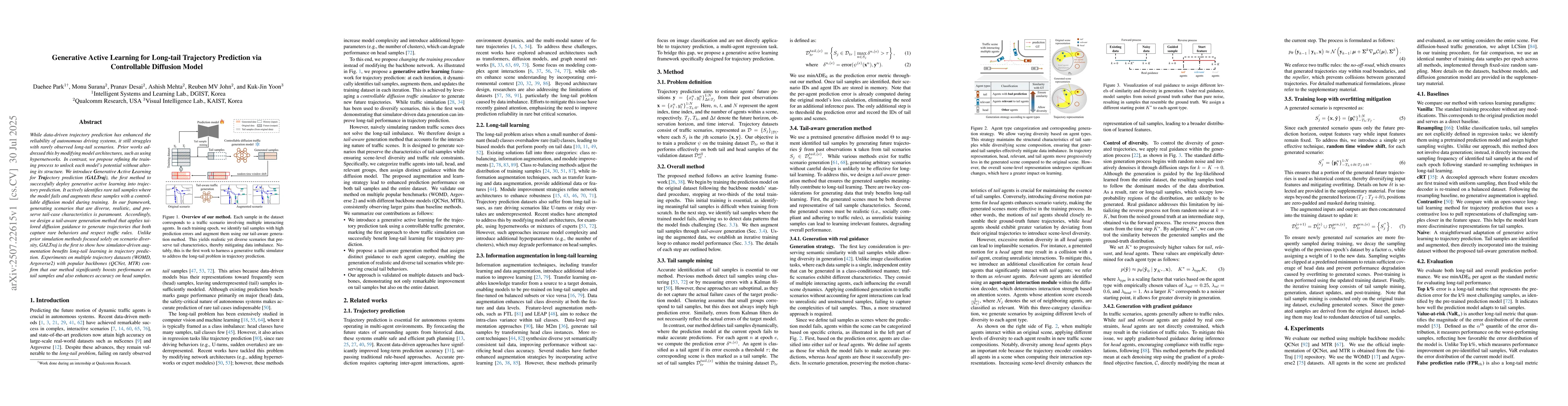The paper introduces Generative Active Learning for Trajectory prediction (GALTraj), a method that refines the training process for trajectory prediction models without altering their structure. GALTraj identifies rare tail samples where the model fails and augments these samples with a controllable diffusion model during training, focusing on generating diverse, realistic, and tail-case characteristic trajectories.