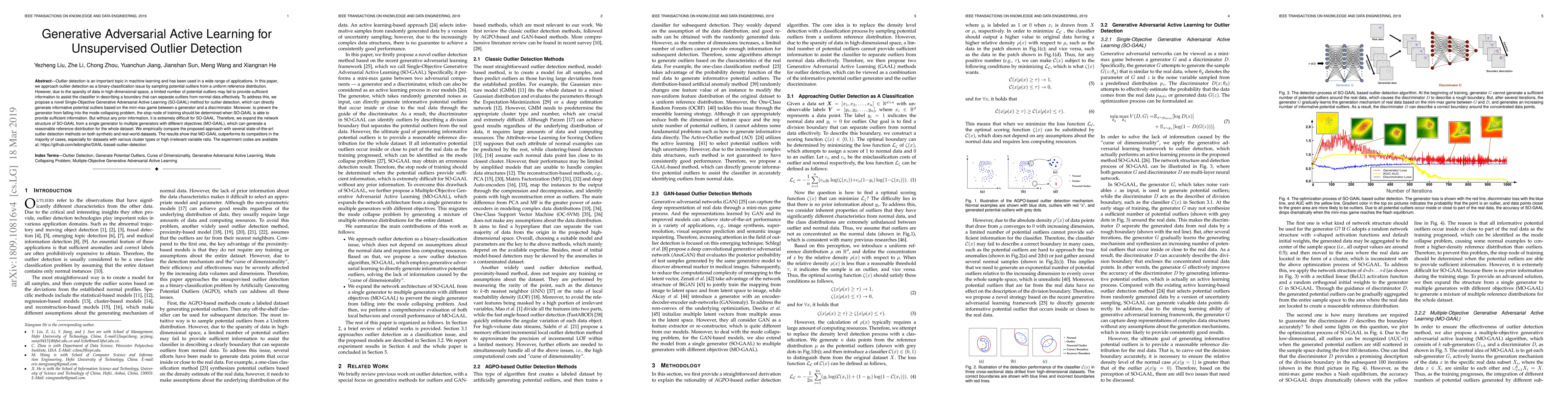 Outlier detection is an important topic in machine learning and has been used in a wide range of applications. In this paper, we approach outlier detection as a binary-classification issue by sampling potential outliers from a uniform reference distribution. However, due to the sparsity of data in high-dimensional space, a limited number of potential outliers may fail to provide sufficient information to assist the classifier in describing a boundary that can separate outliers from normal data effectively. To address this, we propose a novel Single-Objective Generative Adversarial Active Learning (SO-GAAL) method for outlier detection, which can directly generate informative potential outliers based on the mini-max game between a generator and a discriminator. Moreover, to prevent the generator from falling into the mode collapsing problem, the stop node of training should be determined when SO-GAAL is able to provide sufficient information. But without any prior information, it is extremely difficult for SO-GAAL. Therefore, we expand the network structure of SO-GAAL from a single generator to multiple generators with different objectives (MO-GAAL), which can generate a reasonable reference distribution for the whole dataset. We empirically compare the proposed approach with several state-of-the-art outlier detection methods on both synthetic and real-world datasets. The results show that MO-GAAL outperforms its competitors in the majority of cases, especially for datasets with various cluster types or high irrelevant variable ratio.