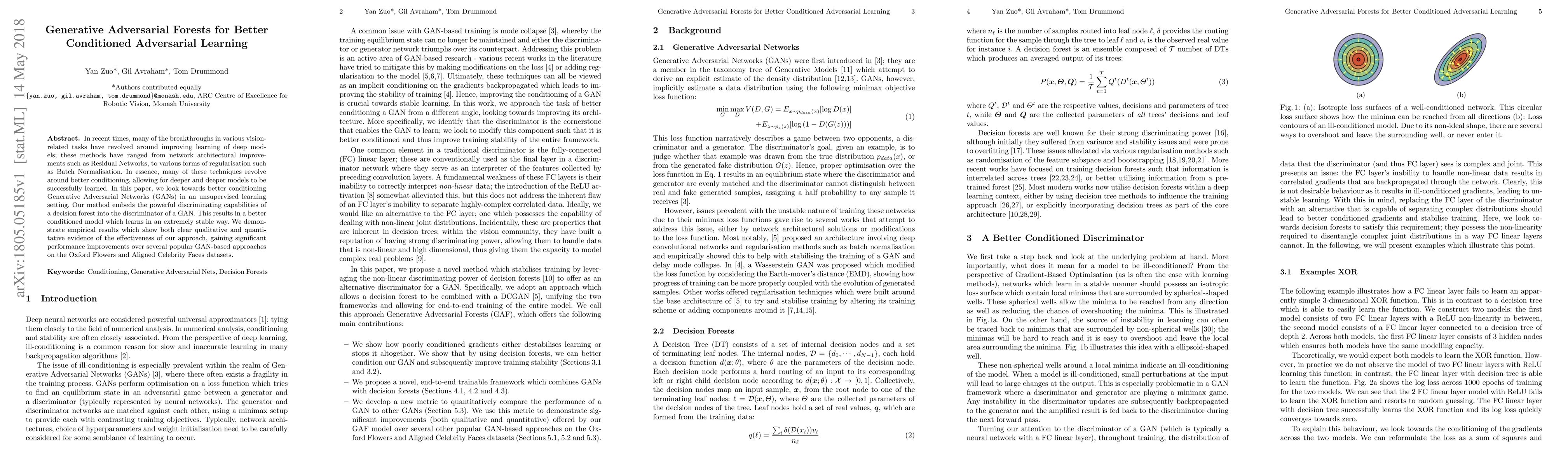 In recent times, many of the breakthroughs in various vision-related tasks have revolved around improving learning of deep models; these methods have ranged from network architectural improvements such as Residual Networks, to various forms of regularisation such as Batch Normalisation. In essence, many of these techniques revolve around better conditioning, allowing for deeper and deeper models to be successfully learned. In this paper, we look towards better conditioning Generative Adversarial Networks (GANs) in an unsupervised learning setting. Our method embeds the powerful discriminating capabilities of a decision forest into the discriminator of a GAN. This results in a better conditioned model which learns in an extremely stable way. We demonstrate empirical results which show both clear qualitative and quantitative evidence of the effectiveness of our approach, gaining significant performance improvements over several popular GAN-based approaches on the Oxford Flowers and Aligned Celebrity Faces datasets.