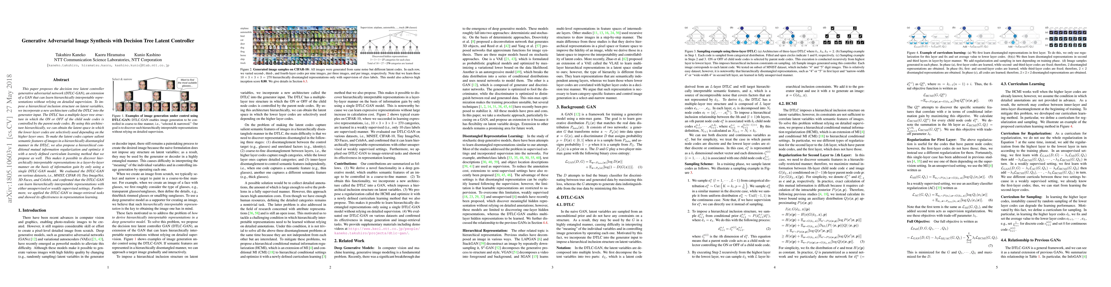 This paper introduces DTLC-GAN, a GAN extension that learns hierarchically interpretable representations without detailed supervision by incorporating a Decision Tree Latent Controller (DTLC) into the generator input. The DTLC has a tree structure where child nodes' ON/OFF is controlled by parent nodes, enabling selective use of lower-layer codes based on higher-layer codes.