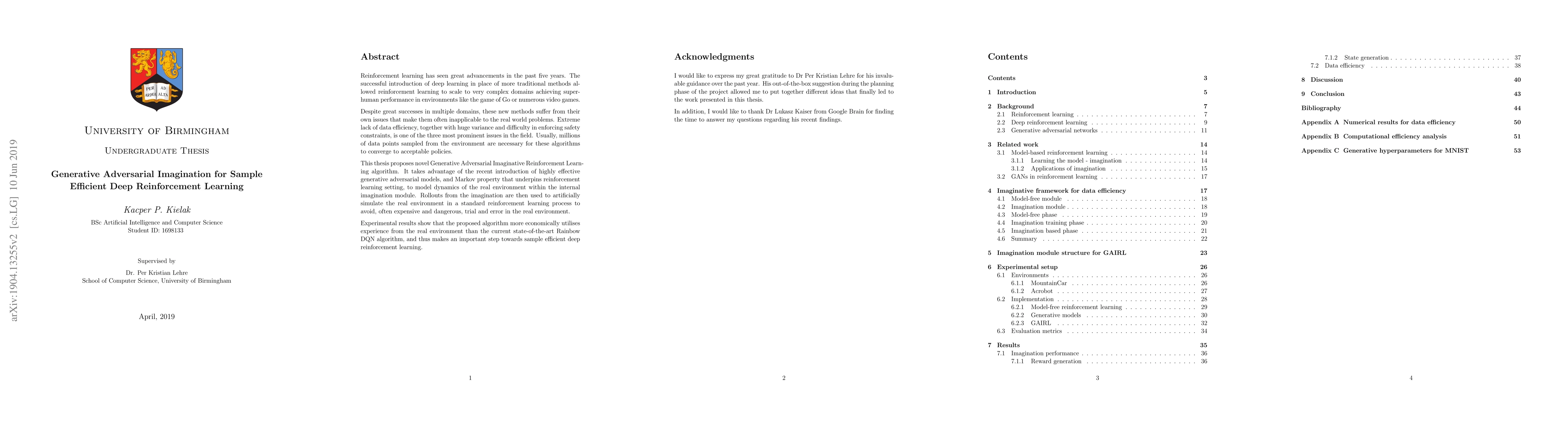 Reinforcement learning has seen great advancements in the past five years. The successful introduction of deep learning in place of more traditional methods allowed reinforcement learning to scale to very complex domains achieving super-human performance in environments like the game of Go or numerous video games. Despite great successes in multiple domains, these new methods suffer from their own issues that make them often inapplicable to the real world problems. Extreme lack of data efficiency, together with huge variance and difficulty in enforcing safety constraints, is one of the three most prominent issues in the field. Usually, millions of data points sampled from the environment are necessary for these algorithms to converge to acceptable policies. This thesis proposes novel Generative Adversarial Imaginative Reinforcement Learning algorithm. It takes advantage of the recent introduction of highly effective generative adversarial models, and Markov property that underpins reinforcement learning setting, to model dynamics of the real environment within the internal imagination module. Rollouts from the imagination are then used to artificially simulate the real environment in a standard reinforcement learning process to avoid, often expensive and dangerous, trial and error in the real environment. Experimental results show that the proposed algorithm more economically utilises experience from the real environment than the current state-of-the-art Rainbow DQN algorithm, and thus makes an important step towards sample efficient deep reinforcement learning.