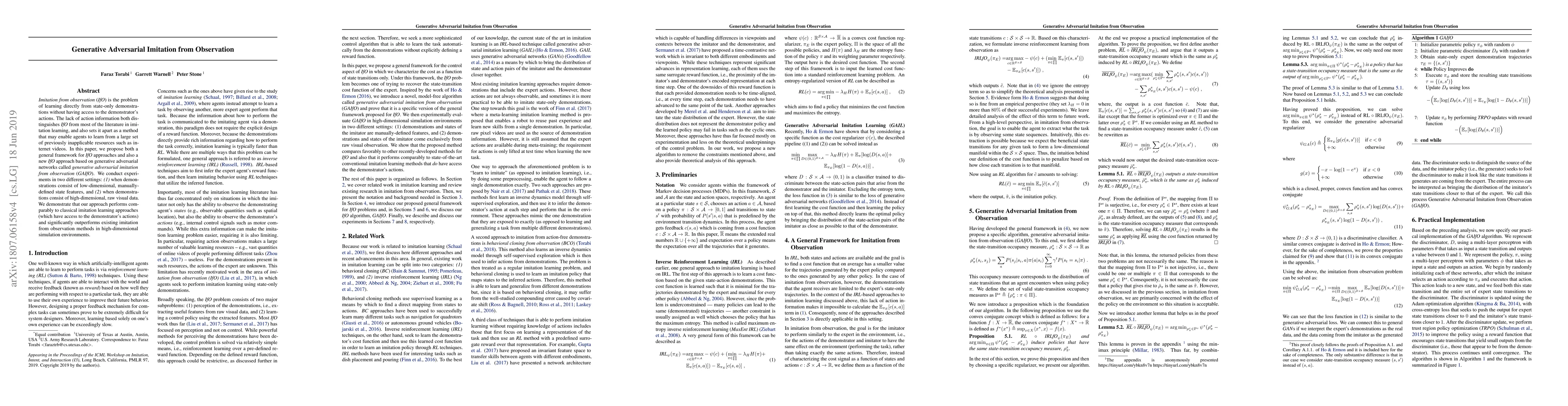 This paper introduces a framework and a new method called generative adversarial imitation from observation (GAIfO) for learning from state-only demonstrations. Experiments show that GAIfO performs comparably to traditional imitation learning and outperforms existing IfO methods, especially in high-dimensional settings.