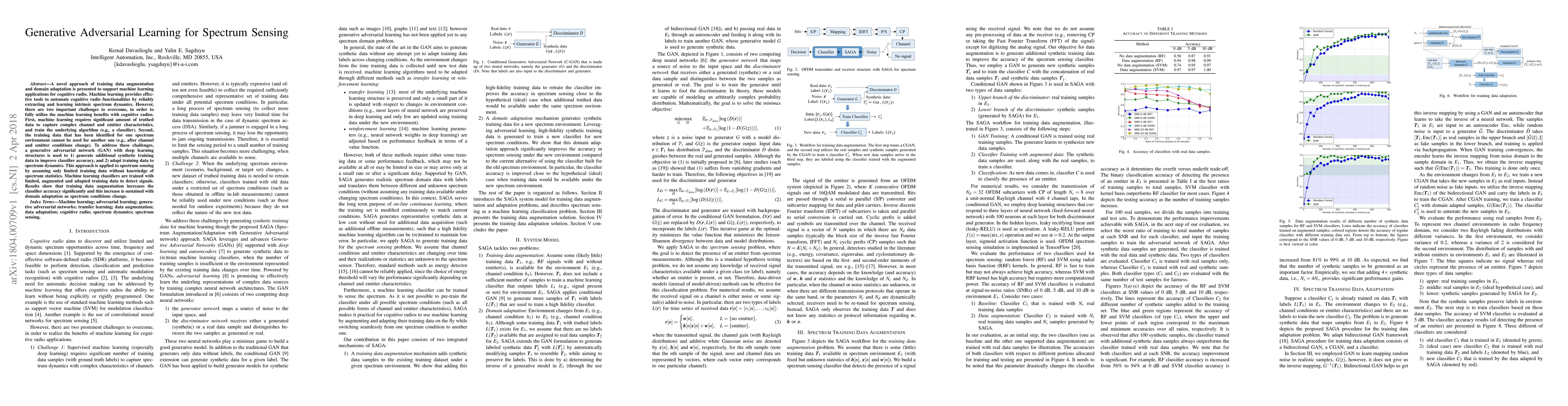 A novel approach of training data augmentation and domain adaptation is presented to support machine learning applications for cognitive radio. Machine learning provides effective tools to automate cognitive radio functionalities by reliably extracting and learning intrinsic spectrum dynamics. However, there are two important challenges to overcome, in order to fully utilize the machine learning benefits with cognitive radios. First, machine learning requires significant amount of truthed data to capture complex channel and emitter characteristics, and train the underlying algorithm (e.g., a classifier). Second, the training data that has been identified for one spectrum environment cannot be used for another one (e.g., after channel and emitter conditions change). To address these challenges, a generative adversarial network (GAN) with deep learning structures is used to 1)~generate additional synthetic training data to improve classifier accuracy, and 2) adapt training data to spectrum dynamics. This approach is applied to spectrum sensing by assuming only limited training data without knowledge of spectrum statistics. Machine learning classifiers are trained with limited, augmented and adapted training data to detect signals. Results show that training data augmentation increases the classifier accuracy significantly and this increase is sustained with domain adaptation as spectrum conditions change.