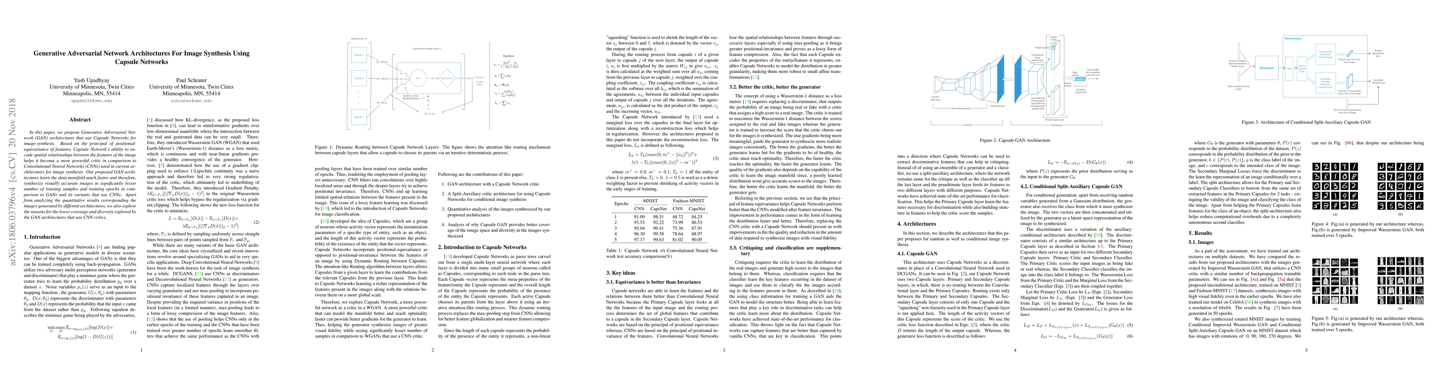 In this paper, we propose Generative Adversarial Network (GAN) architectures that use Capsule Networks for image-synthesis. Based on the principal of positional-equivariance of features, Capsule Network's ability to encode spatial relationships between the features of the image helps it become a more powerful critic in comparison to Convolutional Neural Networks (CNNs) used in current architectures for image synthesis. Our proposed GAN architectures learn the data manifold much faster and therefore, synthesize visually accurate images in significantly lesser number of training samples and training epochs in comparison to GANs and its variants that use CNNs. Apart from analyzing the quantitative results corresponding the images generated by different architectures, we also explore the reasons for the lower coverage and diversity explored by the GAN architectures that use CNN critics.