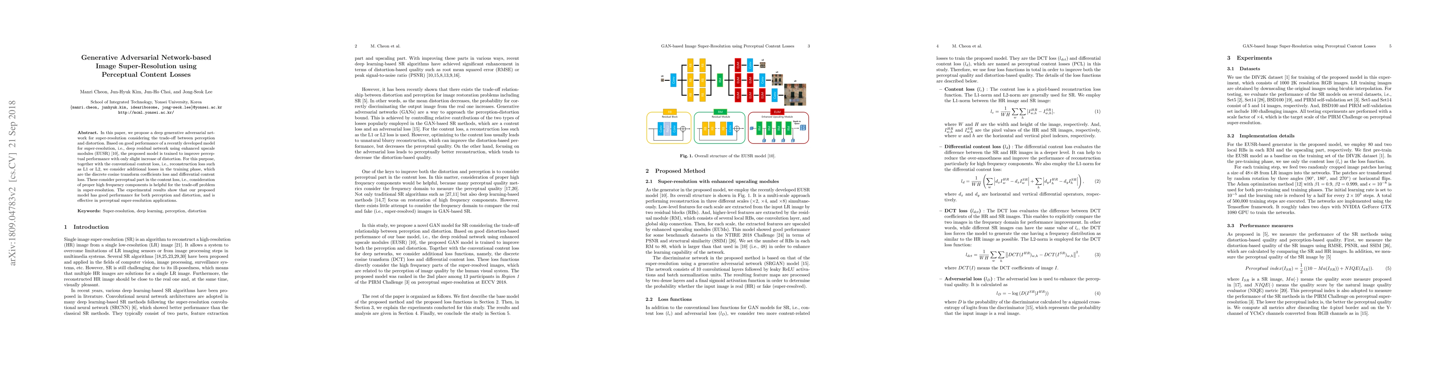 This paper proposes a generative adversarial network for image super-resolution that incorporates perceptual content losses to balance perceptual quality and distortion. The model, built on the EUSR framework, uses additional losses like DCT and differential content loss to enhance perceptual performance, achieving effective results in perceptual super-resolution applications.