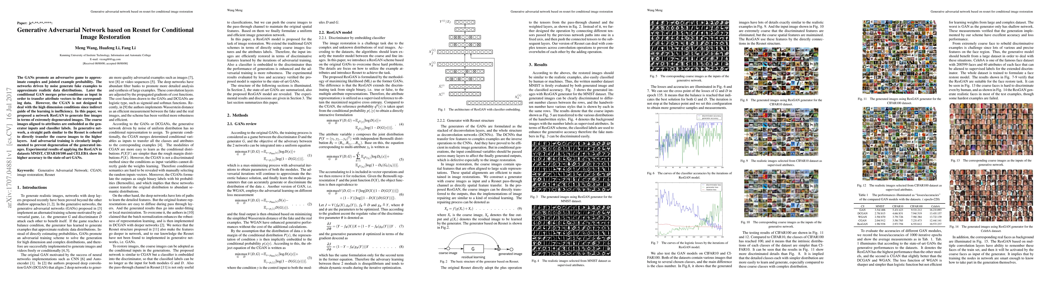 A new Generative Adversarial Network (GAN) model called ResGAN is proposed to improve image restoration accuracy, outperforming existing state-of-the-art GANs on datasets such as MNIST, CIFAR10/100, and CELEBA.