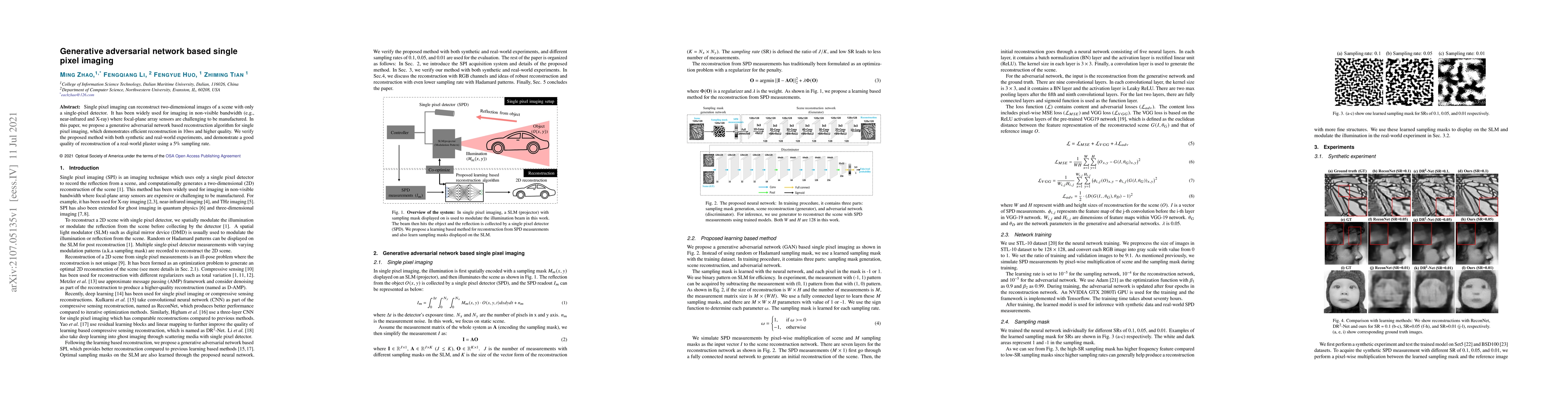 This paper proposes a generative adversarial network (GAN) based reconstruction algorithm for single pixel imaging, achieving efficient reconstruction in 10ms and higher quality compared to traditional methods. The effectiveness of the method is validated through both synthetic and real-world experiments, including the reconstruction of a plaster object at a 0.05 sampling rate.