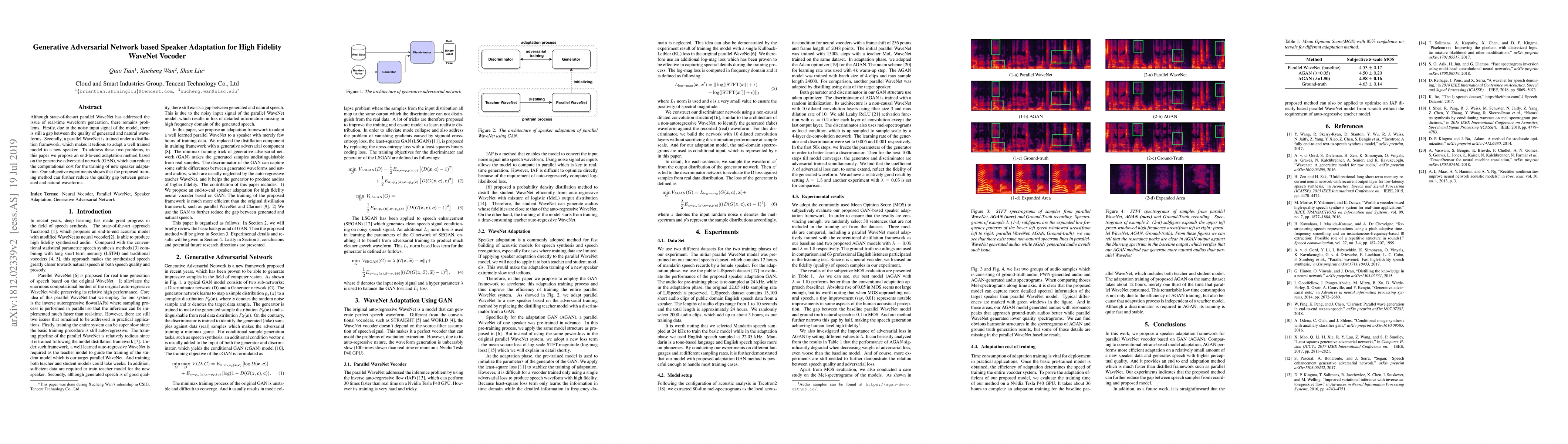 Although state-of-the-art parallel WaveNet has addressed the issue of real-time waveform generation, there remains problems. Firstly, due to the noisy input signal of the model, there is still a gap between the quality of generated and natural waveforms. Secondly, a parallel WaveNet is trained under a distillation framework, which makes it tedious to adapt a well trained model to a new speaker. To address these two problems, in this paper we propose an end-to-end adaptation method based on the generative adversarial network (GAN), which can reduce the computational cost for the training of new speaker adaptation. Our subjective experiments shows that the proposed training method can further reduce the quality gap between generated and natural waveforms.