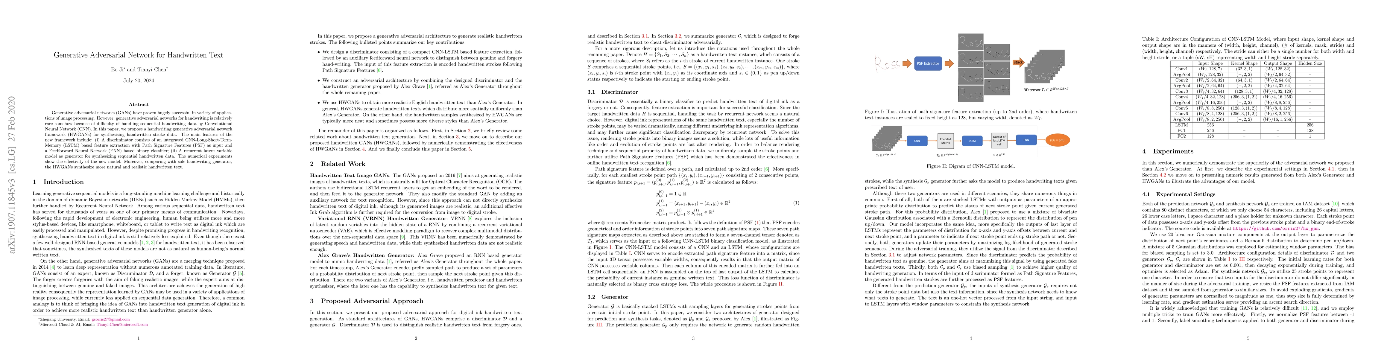 The paper proposes a handwriting generative adversarial network framework (HWGANs) that integrates CNN-LSTM with Path Signature Features (PSF) for a discriminator and employs a recurrent latent variable model as a generator for synthesizing sequential handwritten data.