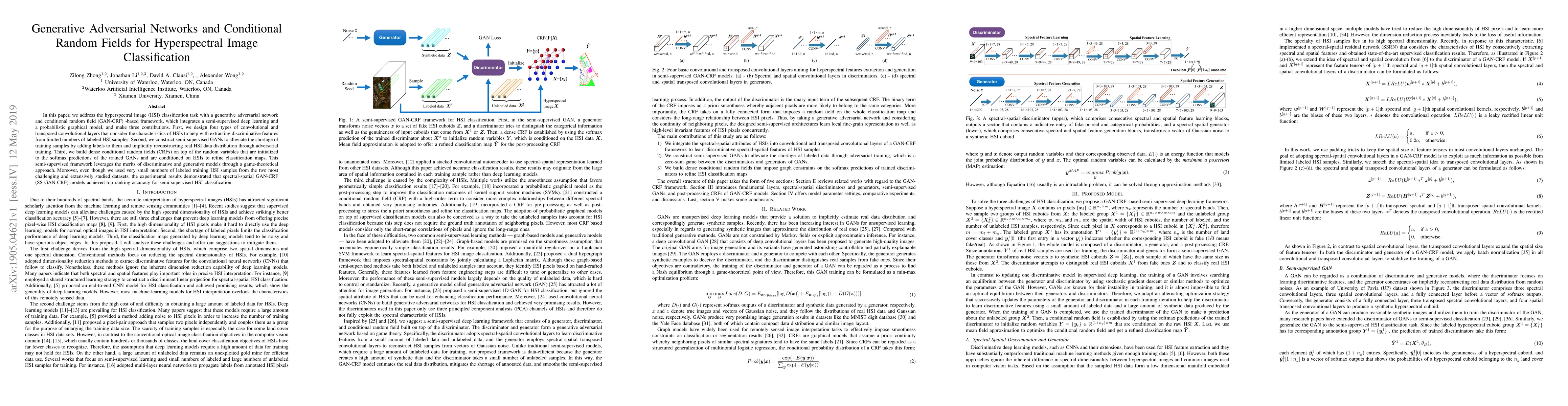 This paper proposes a GAN-CRF framework for hyperspectral image classification, combining semi-supervised deep learning with probabilistic modeling. The approach extracts discriminative features from limited labeled HSI samples and achieves top-ranking accuracy despite small training sets.