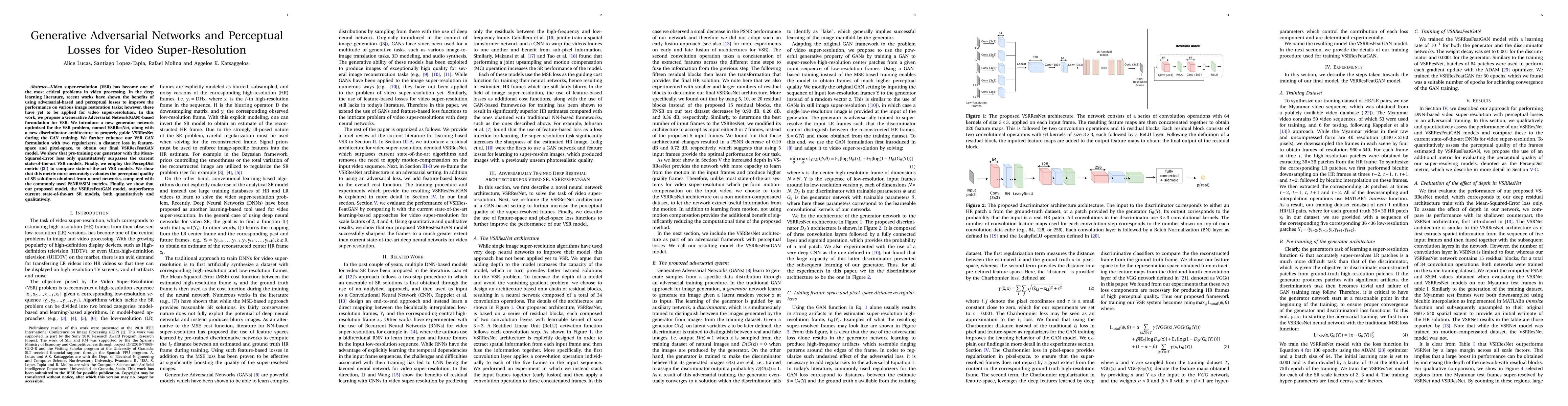 This paper proposes a GAN-based approach for video super-resolution (VSR) using a new generator network, VSRResNet, and a discriminator architecture. The VSRResFeatGAN model, enhanced with perceptual and distance losses, outperforms existing VSR models both quantitatively and qualitatively, as evaluated using the PercepDist metric.