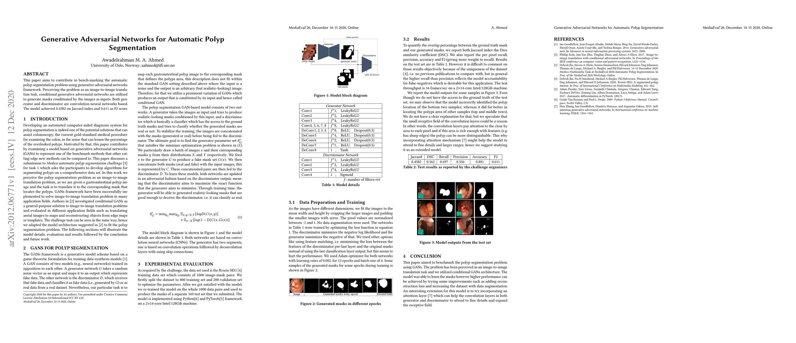 This paper benchmarks automatic polyp segmentation using conditional generative adversarial networks, achieving a Jaccard index of 0.4382 and an F2 score of 0.611. The approach treats polyp segmentation as an image-to-image translation task.