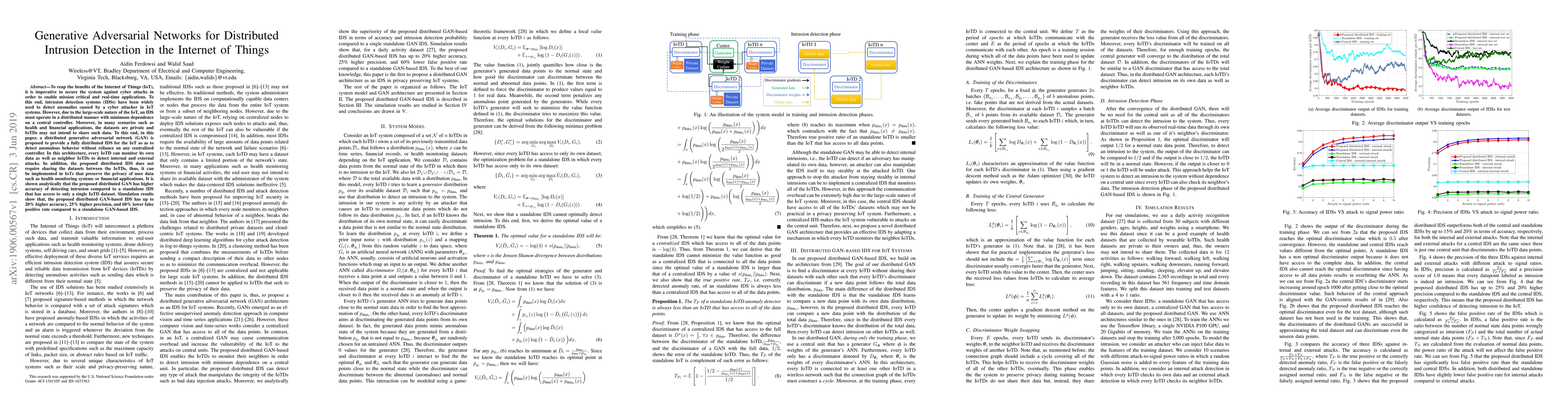 To reap the benefits of the Internet of Things (IoT), it is imperative to secure the system against cyber attacks in order to enable mission critical and real-time applications. To this end, intrusion detection systems (IDSs) have been widely used to detect anomalies caused by a cyber attacker in IoT systems. However, due to the large-scale nature of the IoT, an IDS must operate in a distributed manner with minimum dependence on a central controller. Moreover, in many scenarios such as health and financial applications, the datasets are private and IoTDs may not intend to share such data. To this end, in this paper, a distributed generative adversarial network (GAN) is proposed to provide a fully distributed IDS for the IoT so as to detect anomalous behavior without reliance on any centralized controller. In this architecture, every IoTD can monitor its own data as well as neighbor IoTDs to detect internal and external attacks. In addition, the proposed distributed IDS does not require sharing the datasets between the IoTDs, thus, it can be implemented in IoTs that preserve the privacy of user data such as health monitoring systems or financial applications. It is shown analytically that the proposed distributed GAN has higher accuracy of detecting intrusion compared to a standalone IDS that has access to only a single IoTD dataset. Simulation results show that, the proposed distributed GAN-based IDS has up to 20% higher accuracy, 25% higher precision, and 60% lower false positive rate compared to a standalone GAN-based IDS.