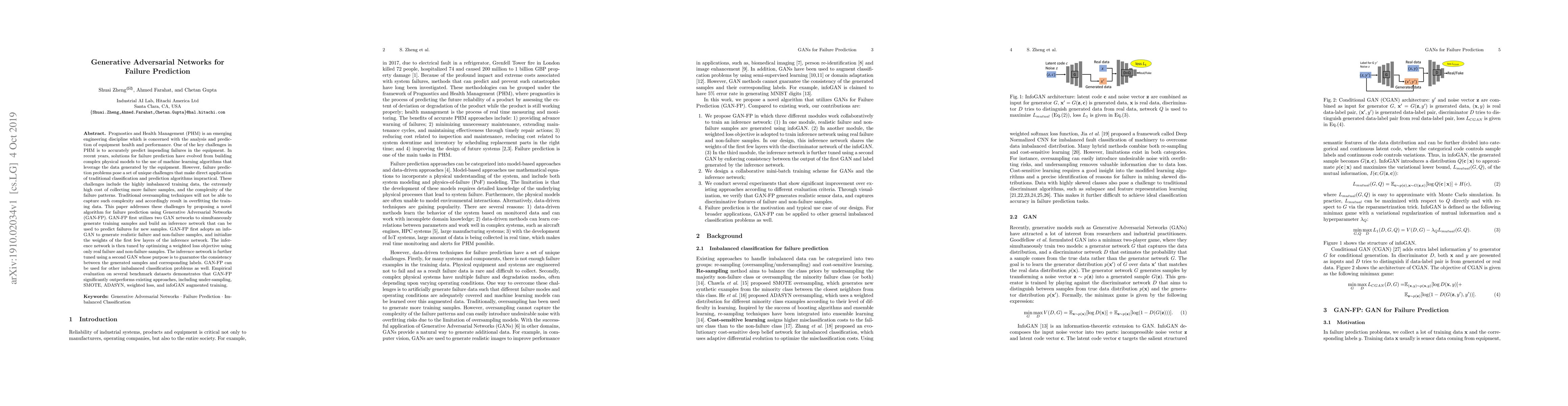 Prognostics and Health Management (PHM) is an emerging engineering discipline which is concerned with the analysis and prediction of equipment health and performance. One of the key challenges in PHM is to accurately predict impending failures in the equipment. In recent years, solutions for failure prediction have evolved from building complex physical models to the use of machine learning algorithms that leverage the data generated by the equipment. However, failure prediction problems pose a set of unique challenges that make direct application of traditional classification and prediction algorithms impractical. These challenges include the highly imbalanced training data, the extremely high cost of collecting more failure samples, and the complexity of the failure patterns. Traditional oversampling techniques will not be able to capture such complexity and accordingly result in overfitting the training data. This paper addresses these challenges by proposing a novel algorithm for failure prediction using Generative Adversarial Networks (GAN-FP). GAN-FP first utilizes two GAN networks to simultaneously generate training samples and build an inference network that can be used to predict failures for new samples. GAN-FP first adopts an infoGAN to generate realistic failure and non-failure samples, and initialize the weights of the first few layers of the inference network. The inference network is then tuned by optimizing a weighted loss objective using only real failure and non-failure samples. The inference network is further tuned using a second GAN whose purpose is to guarantee the consistency between the generated samples and corresponding labels. GAN-FP can be used for other imbalanced classification problems as well.