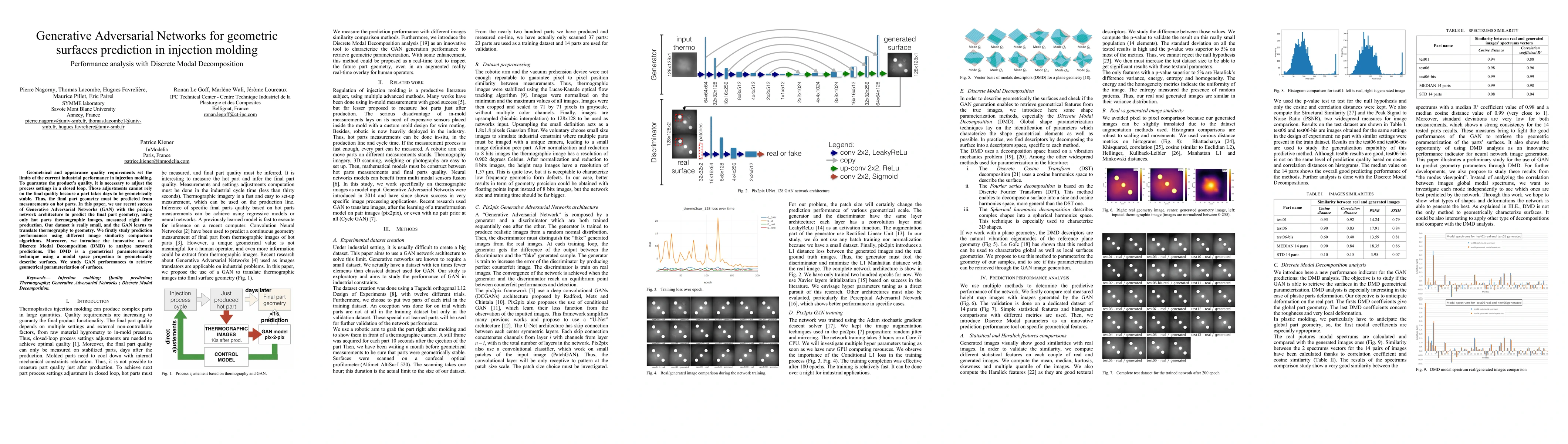 Geometrical and appearance quality requirements set the limits of the current industrial performance in injection molding. To guarantee the product's quality, it is necessary to adjust the process settings in a closed loop. Those adjustments cannot rely on the final quality because a part takes days to be geometrically stable. Thus, the final part geometry must be predicted from measurements on hot parts. In this paper, we use recent success of Generative Adversarial Networks (GAN) with the pix2pix network architecture to predict the final part geometry, using only hot parts thermographic images, measured right after production. Our dataset is really small, and the GAN learns to translate thermography to geometry. We firstly study prediction performances using different image similarity comparison algorithms. Moreover, we introduce the innovative use of Discrete Modal Decomposition (DMD) to analyze network predictions. The DMD is a geometrical parameterization technique using a modal space projection to geometrically describe surfaces. We study GAN performances to retrieve geometrical parameterization of surfaces.