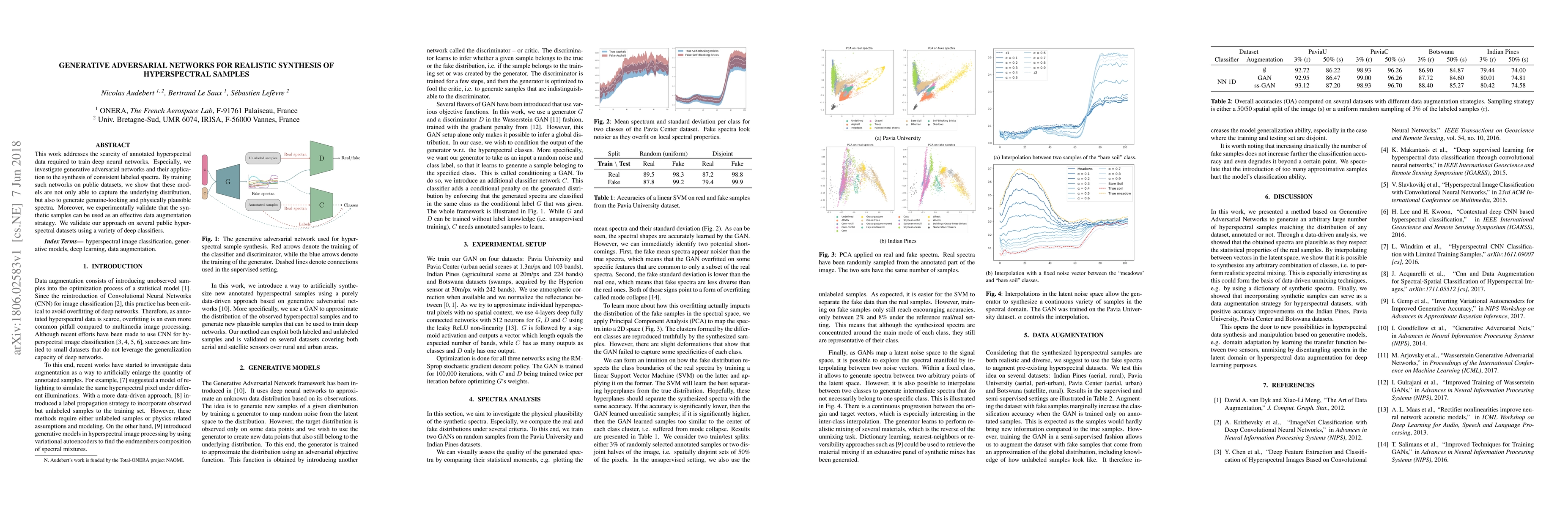 This paper explores the use of generative adversarial networks (GANs) to generate realistic hyperspectral samples, addressing the lack of annotated data. The trained GANs successfully synthesize physically plausible spectra, which are validated as effective for data augmentation across multiple public datasets.