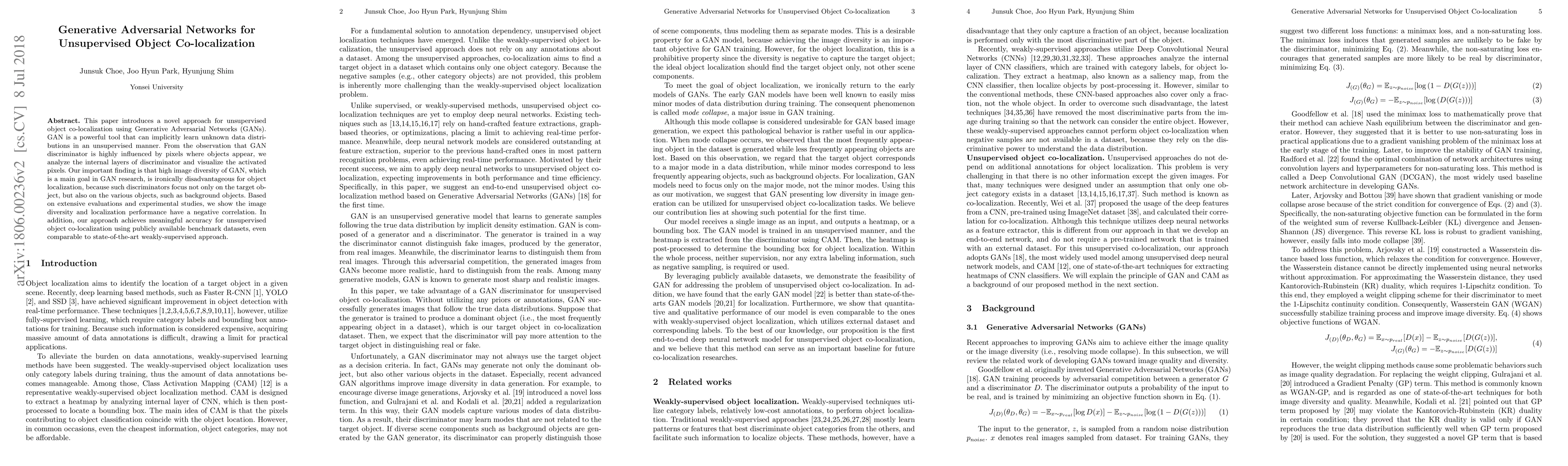 This paper proposes an unsupervised method for object co-localization using Generative Adversarial Networks, finding that high image diversity in GANs can hinder localization due to focus on background objects. The approach achieves competitive accuracy on benchmark datasets.