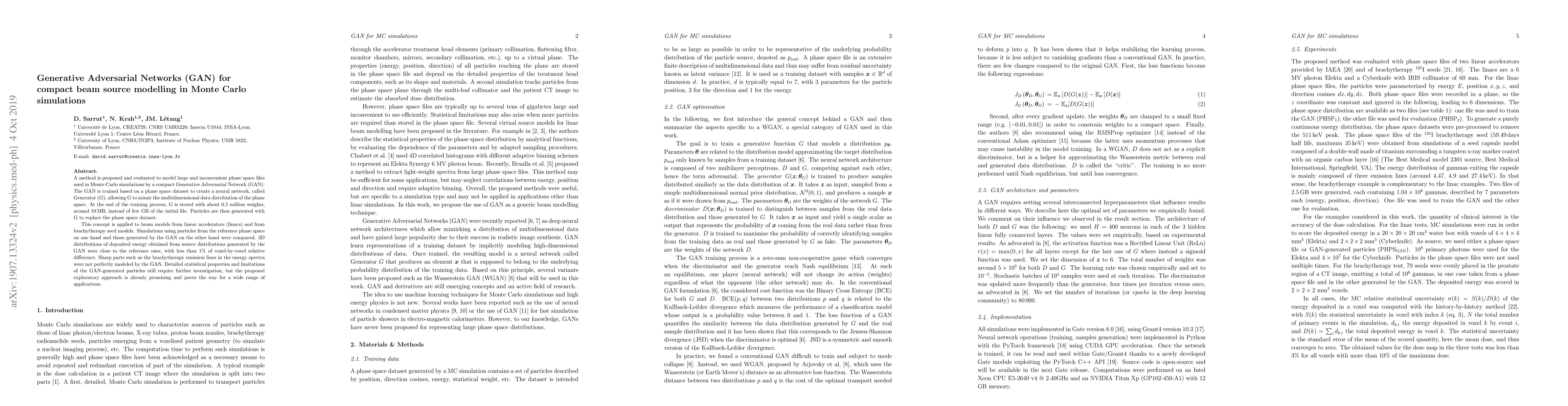 A method is proposed and evaluated to model large and inconvenient phase space files used in Monte Carlo simulations by a compact Generative Adversarial Network (GAN). The GAN is trained based on a phase space dataset to create a neural network, called Generator (G), allowing G to mimic the multidimensional data distribution of the phase space. At the end of the training process, G is stored with about 0.5 million weights, around 10 MB, instead of few GB of the initial file. Particles are then generated with G to replace the phase space dataset. This concept is applied to beam models from linear accelerators (linacs) and from brachytherapy seed models. Simulations using particles from the reference phase space on one hand and those generated by the GAN on the other hand were compared. 3D distributions of deposited energy obtained from source distributions generated by the GAN were close to the reference ones, with less than 1% of voxel-by-voxel relative difference. Sharp parts such as the brachytherapy emission lines in the energy spectra were not perfectly modeled by the GAN. Detailed statistical properties and limitations of the GAN-generated particles still require further investigation, but the proposed exploratory approach is already promising and paves the way for a wide range of applications.