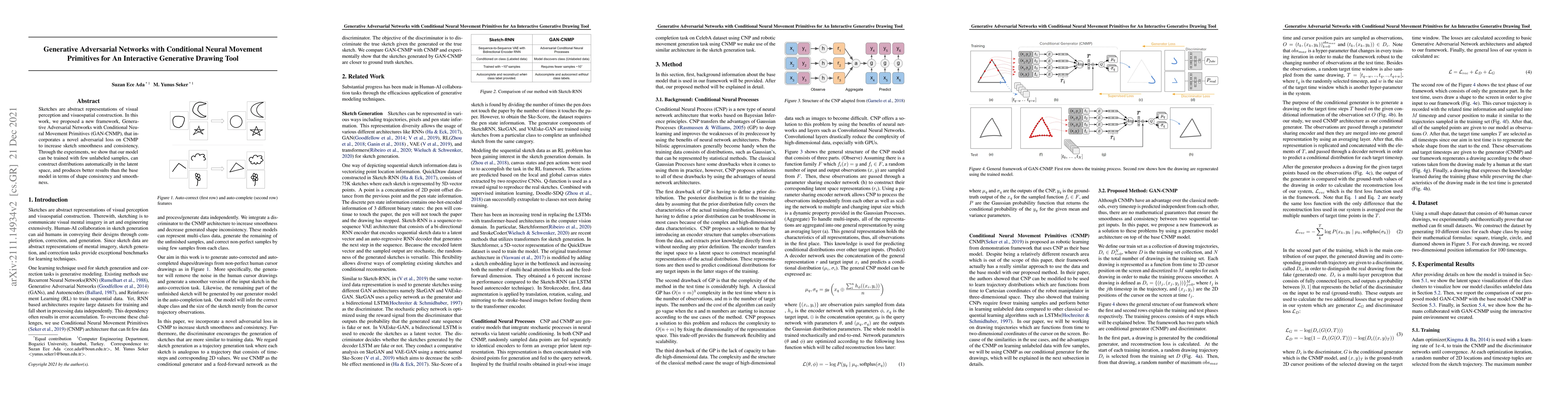 This paper introduces GAN-CNMP, a framework combining Generative Adversarial Networks with Conditional Neural Movement Primitives for an interactive generative drawing tool, achieving improved sketch smoothness and consistency with fewer samples. The model outperforms the base model in shape consistency and smoothness.