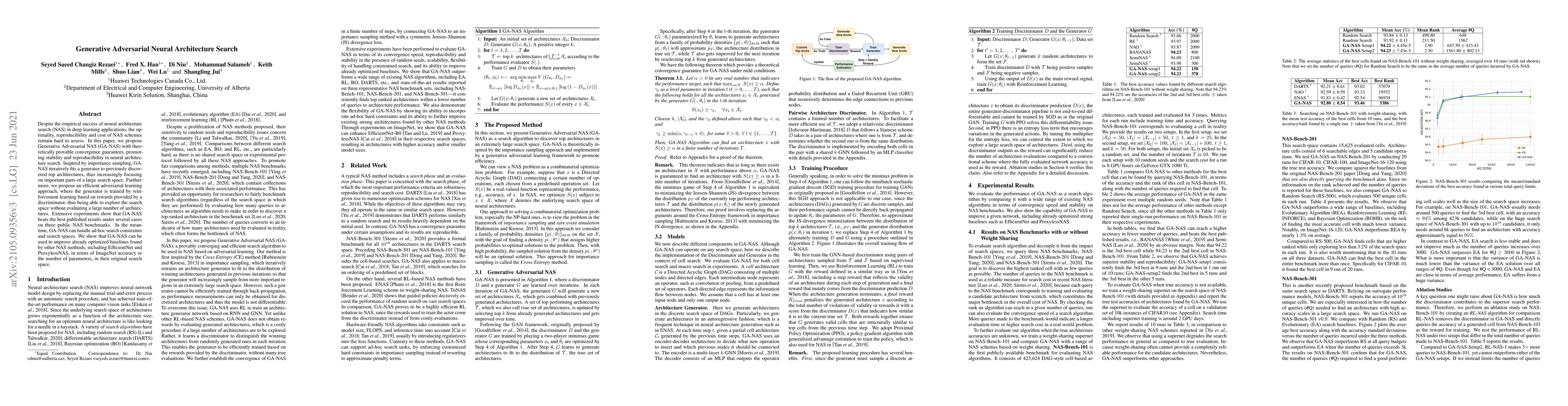 This paper proposes Generative Adversarial Neural Architecture Search (GA-NAS) to improve the stability and reproducibility of neural architecture search, leveraging an adversarial learning approach to efficiently explore large search spaces without evaluating many architectures. GA-NAS outperforms existing methods on multiple benchmarks and can enhance optimized baselines like EfficientNet.
