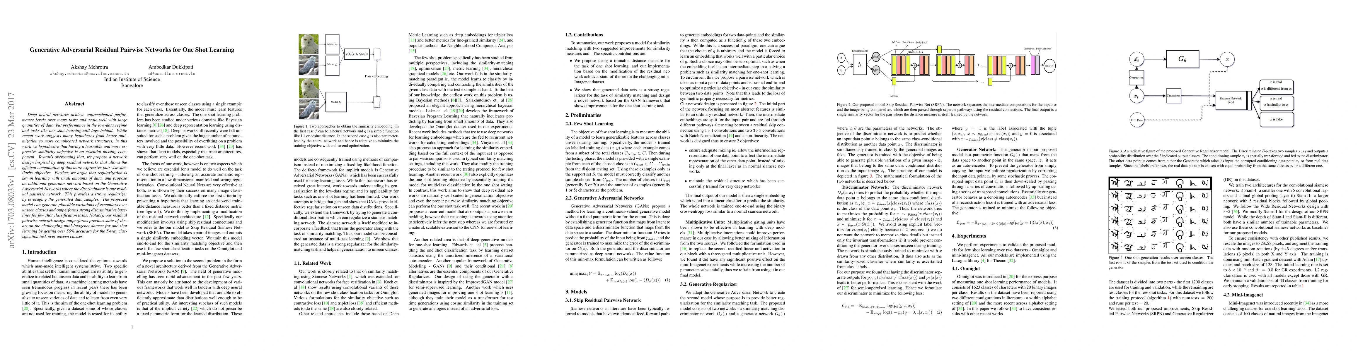 The paper presents a novel Skip Residual Pairwise Network design and a Generative Regularizer, both aiming to enhance similarity matching and one-shot learning by providing a more expressive similarity objective and strong regularization.