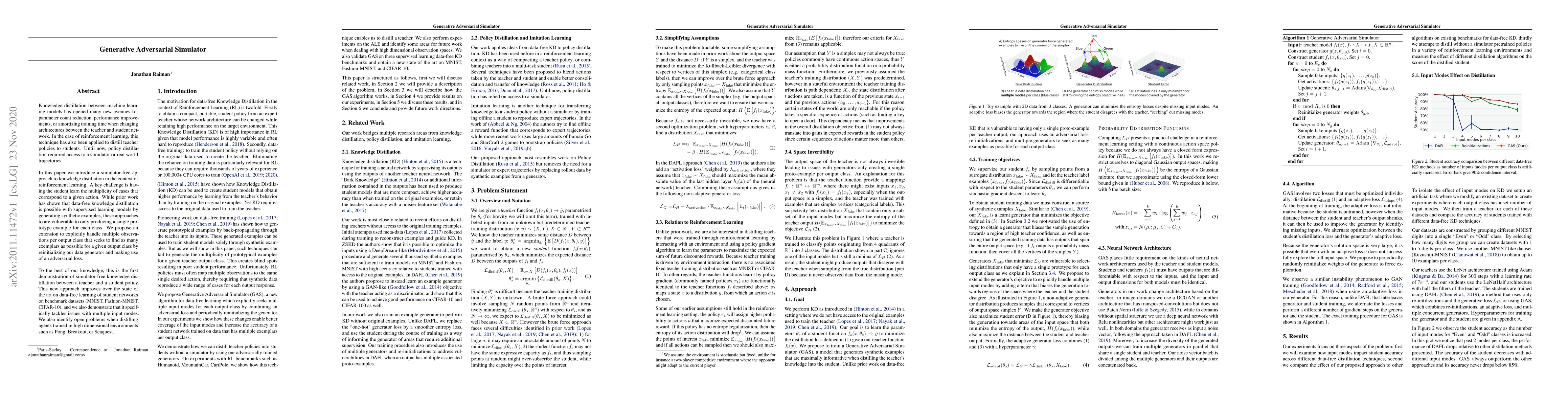 Knowledge distillation between machine learning models has opened many new avenues for parameter count reduction, performance improvements, or amortizing training time when changing architectures between the teacher and student network. In the case of reinforcement learning, this technique has also been applied to distill teacher policies to students. Until now, policy distillation required access to a simulator or real world trajectories. In this paper we introduce a simulator-free approach to knowledge distillation in the context of reinforcement learning. A key challenge is having the student learn the multiplicity of cases that correspond to a given action. While prior work has shown that data-free knowledge distillation is possible with supervised learning models by generating synthetic examples, these approaches to are vulnerable to only producing a single prototype example for each class. We propose an extension to explicitly handle multiple observations per output class that seeks to find as many exemplars as possible for a given output class by reinitializing our data generator and making use of an adversarial loss. To the best of our knowledge, this is the first demonstration of simulator-free knowledge distillation between a teacher and a student policy. This new approach improves over the state of the art on data-free learning of student networks on benchmark datasets (MNIST, Fashion-MNIST, CIFAR-10), and we also demonstrate that it specifically tackles issues with multiple input modes. We also identify open problems when distilling agents trained in high dimensional environments such as Pong, Breakout, or Seaquest.