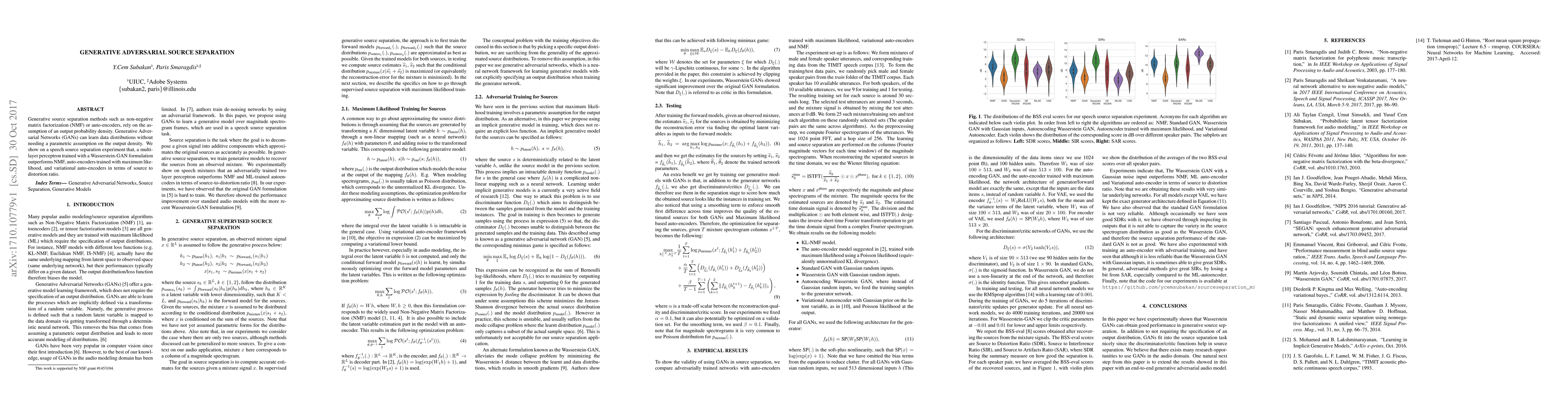 Generative source separation methods such as non-negative matrix factorization (NMF) or auto-encoders, rely on the assumption of an output probability density. Generative Adversarial Networks (GANs) can learn data distributions without needing a parametric assumption on the output density. We show on a speech source separation experiment that, a multi-layer perceptron trained with a Wasserstein-GAN formulation outperforms NMF, auto-encoders trained with maximum likelihood, and variational auto-encoders in terms of source to distortion ratio.