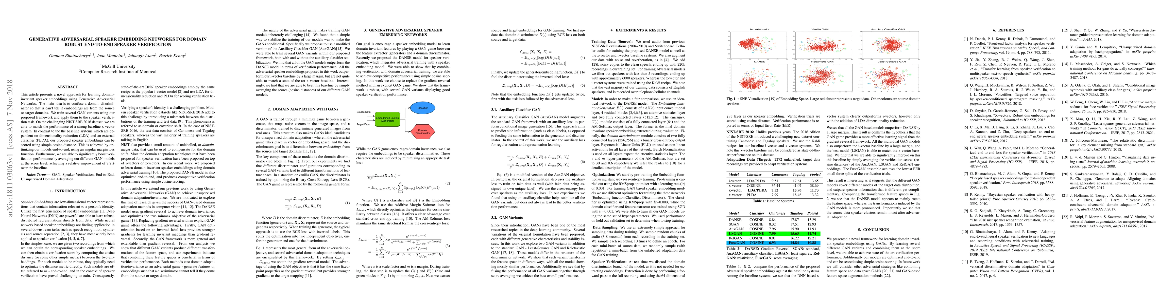 This paper introduces a Generative Adversarial Network (GAN) approach for learning domain-invariant speaker embeddings, achieving competitive performance on the NIST-SRE 2016 dataset. The proposed method outperforms baseline systems by averaging multiple GAN models, resulting in a 7.2% relative improvement.