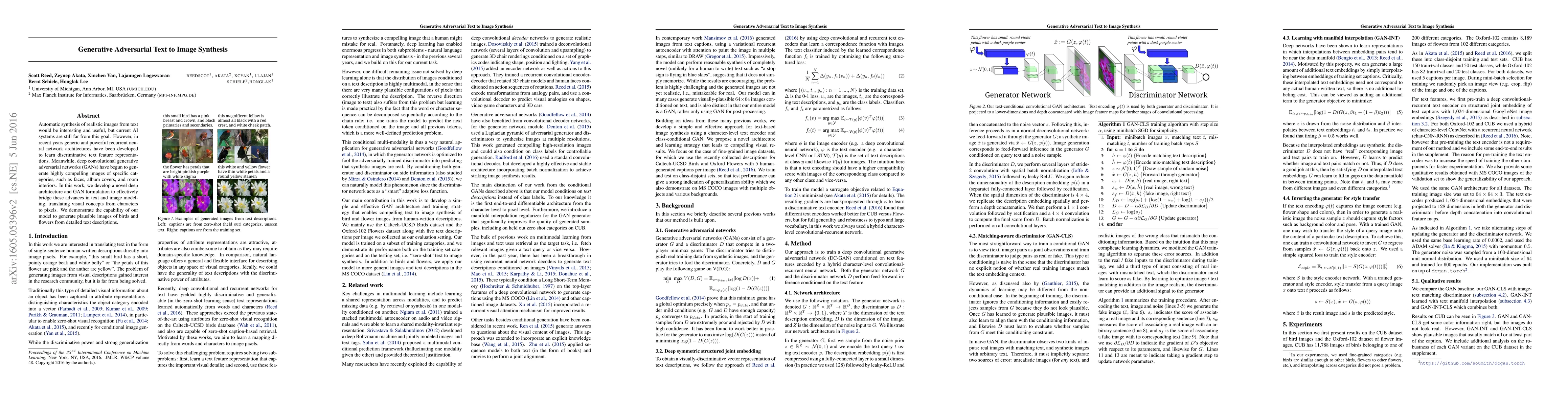 This paper introduces a novel deep architecture and GAN formulation to synthesize realistic images from text descriptions, combining advances in text feature representations and deep convolutional GANs. The model successfully generates plausible images of birds and flowers from detailed textual inputs.