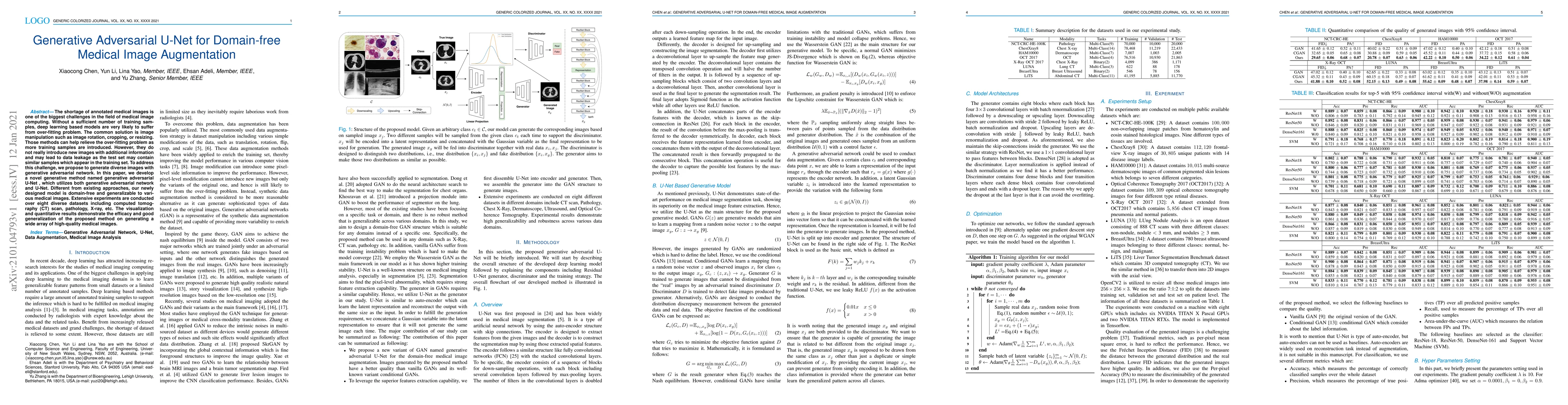 The shortage of annotated medical images is one of the biggest challenges in the field of medical image computing. Without a sufficient number of training samples, deep learning based models are very likely to suffer from over-fitting problem. The common solution is image manipulation such as image rotation, cropping, or resizing. Those methods can help relieve the over-fitting problem as more training samples are introduced. However, they do not really introduce new images with additional information and may lead to data leakage as the test set may contain similar samples which appear in the training set. To address this challenge, we propose to generate diverse images with generative adversarial network. In this paper, we develop a novel generative method named generative adversarial U-Net , which utilizes both generative adversarial network and U-Net. Different from existing approaches, our newly designed model is domain-free and generalizable to various medical images. Extensive experiments are conducted over eight diverse datasets including computed tomography (CT) scan, pathology, X-ray, etc. The visualization and quantitative results demonstrate the efficacy and good generalization of the proposed method on generating a wide array of high-quality medical images.