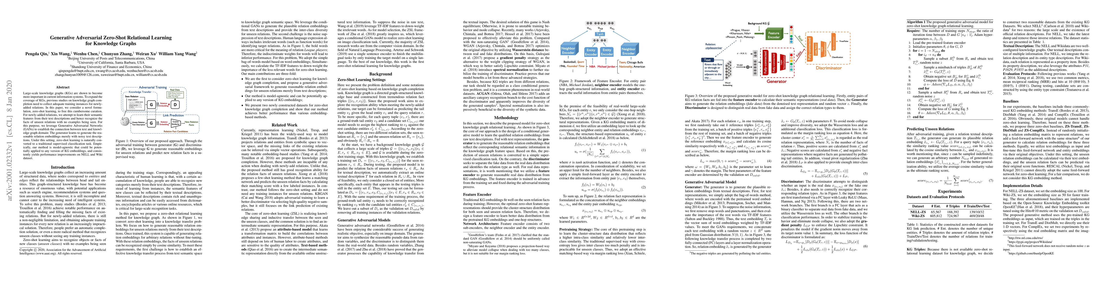 This paper introduces a generative adversarial approach for zero-shot relational learning in knowledge graphs, leveraging GANs to generate relation embeddings from text descriptions without needing training examples. The method demonstrates improved performance on NELL and Wiki datasets, indicating its model-agnostic applicability.