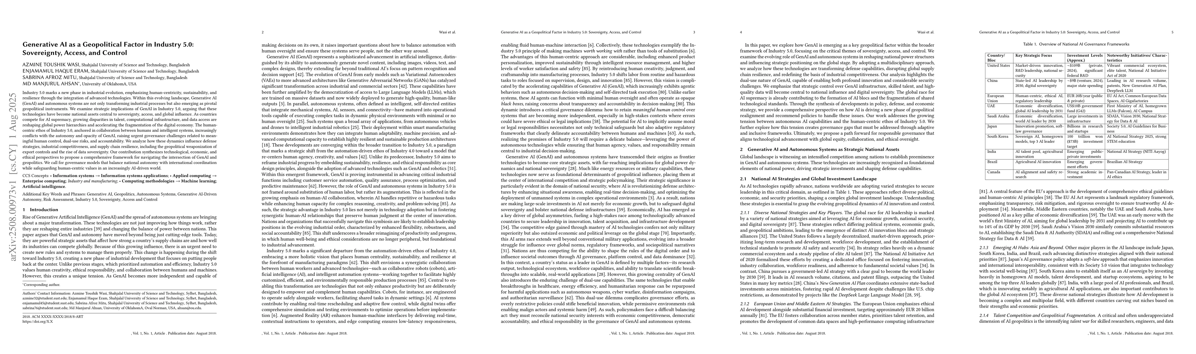 Industry 5.0 marks a new phase in industrial evolution, emphasizing human-centricity, sustainability, and resilience through the integration of advanced technologies. Within this evolving landscape, Generative AI (GenAI) and autonomous systems are not only transforming industrial processes but also emerging as pivotal geopolitical instruments. We examine strategic implications of GenAI in Industry 5.0, arguing that these technologies have become national assets central to sovereignty, access, and global influence. As countries compete for AI supremacy, growing disparities in talent, computational infrastructure, and data access are reshaping global power hierarchies and accelerating the fragmentation of the digital economy. The human-centric ethos of Industry 5.0, anchored in collaboration between humans and intelligent systems, increasingly conflicts with the autonomy and opacity of GenAI, raising urgent governance challenges related to meaningful human control, dual-use risks, and accountability. We analyze how these dynamics influence defense strategies, industrial competitiveness, and supply chain resilience, including the geopolitical weaponization of export controls and the rise of data sovereignty. Our contribution synthesizes technological, economic, and ethical perspectives to propose a comprehensive framework for navigating the intersection of GenAI and geopolitics. We call for governance models that balance national autonomy with international coordination while safeguarding human-centric values in an increasingly AI-driven world.