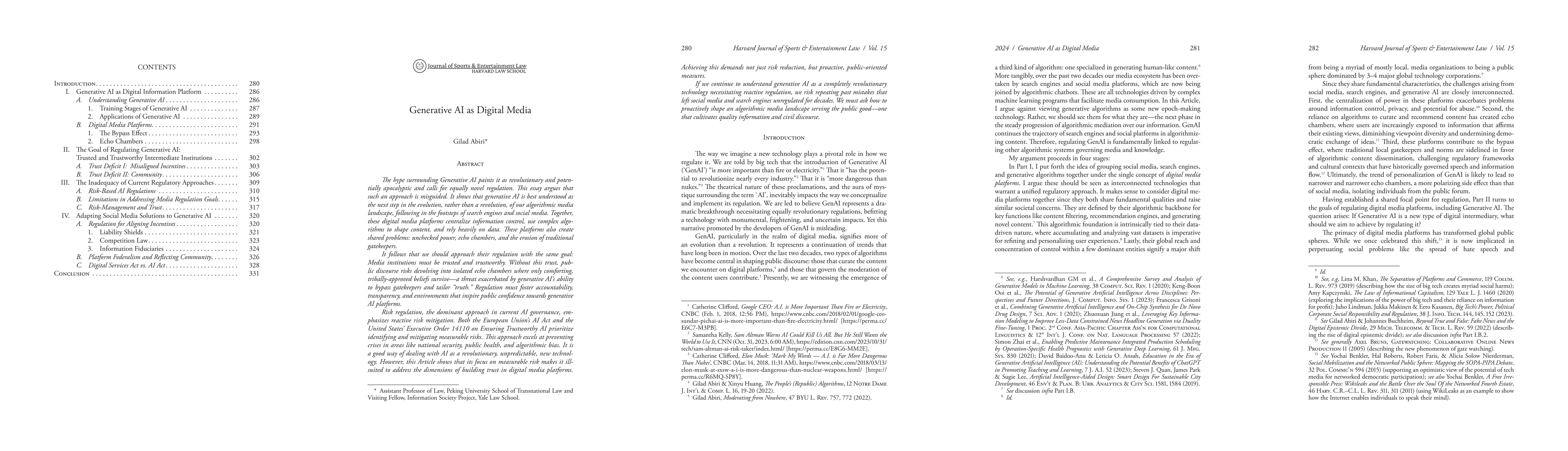 The paper contributes to the discourse on digital media regulation by positioning generative AI as an evolutionary step in the broader algorithmic media landscape, emphasizing the need for proactive regulation focused on trust and legitimacy.