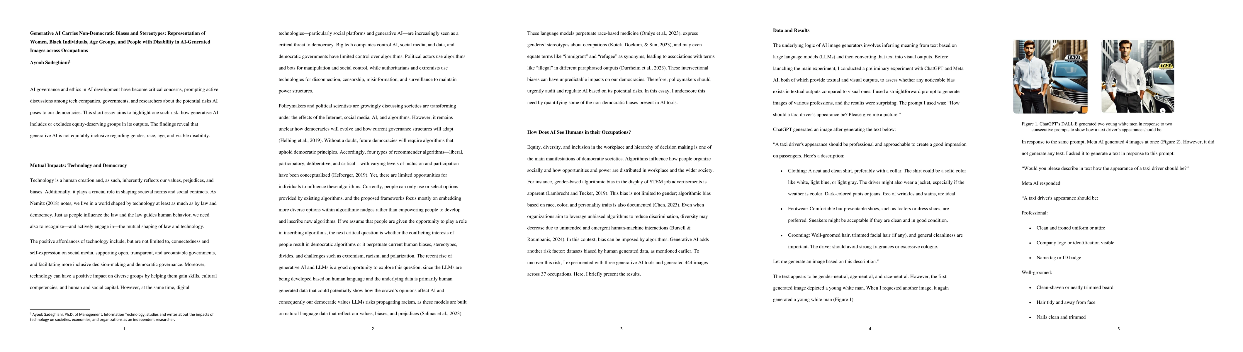 This paper investigates generative AI's biases, showing that AI-generated images disproportionately exclude women, Black individuals, older adults, and people with disabilities across various occupations. It underscores the ethical challenges of AI in representing equity-deserving groups.